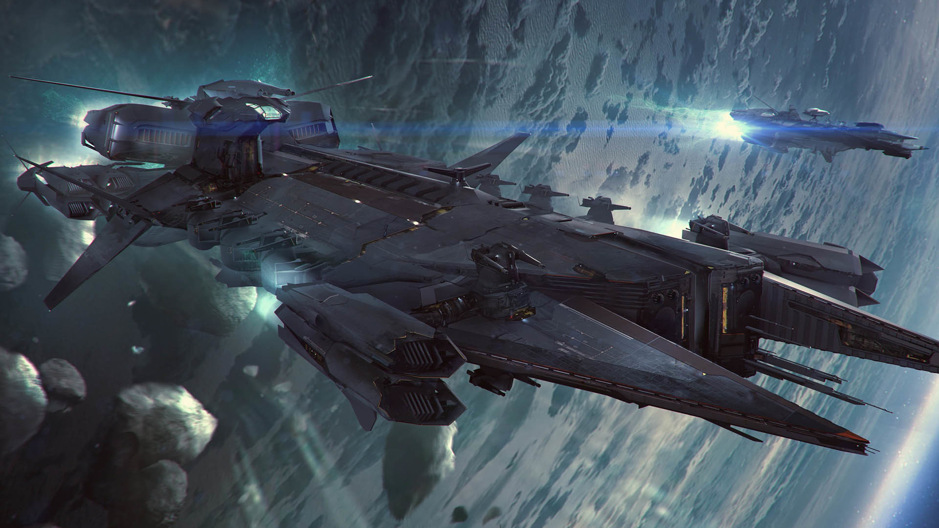 Description: A space ship flying over a planet in space with a satellite satellite in the background and a satellite satellite in the foreground.