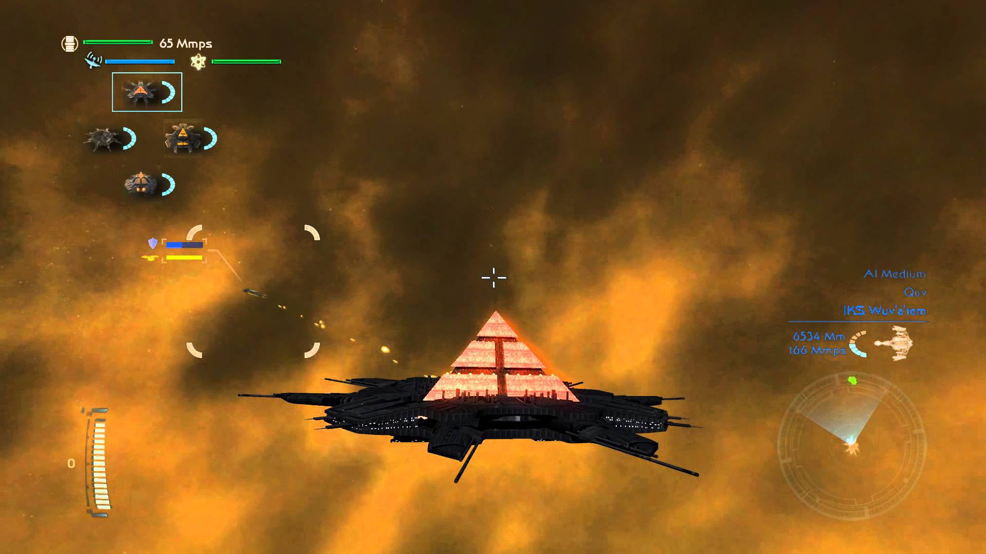 Description: A computer generated image of a space ship in flight with a red triangle on the front of it and a yellow triangle on the back.