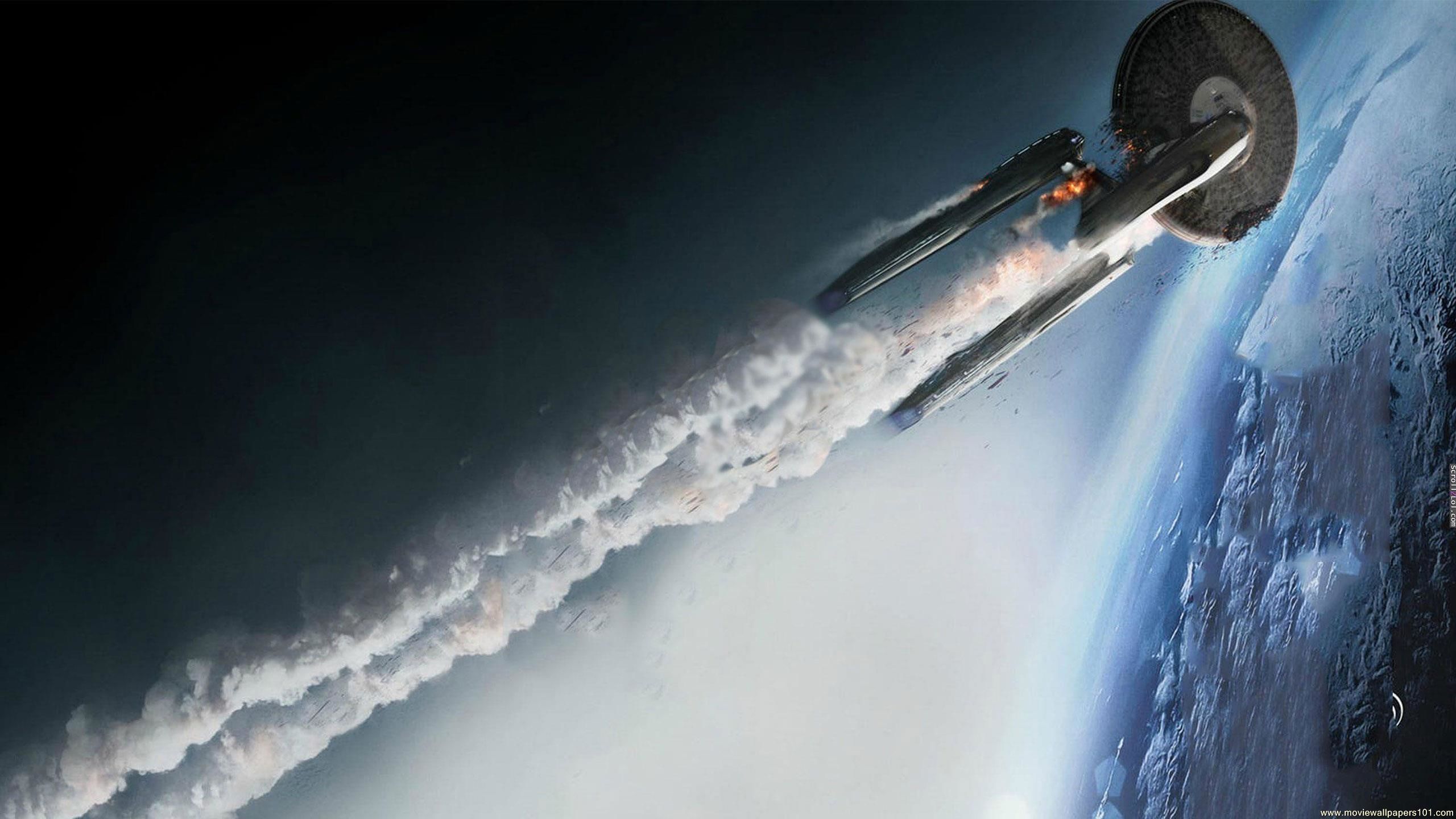 Description: A space shuttle flying through the air with smoke coming out of it's back end and a rocket on the side of the space.
