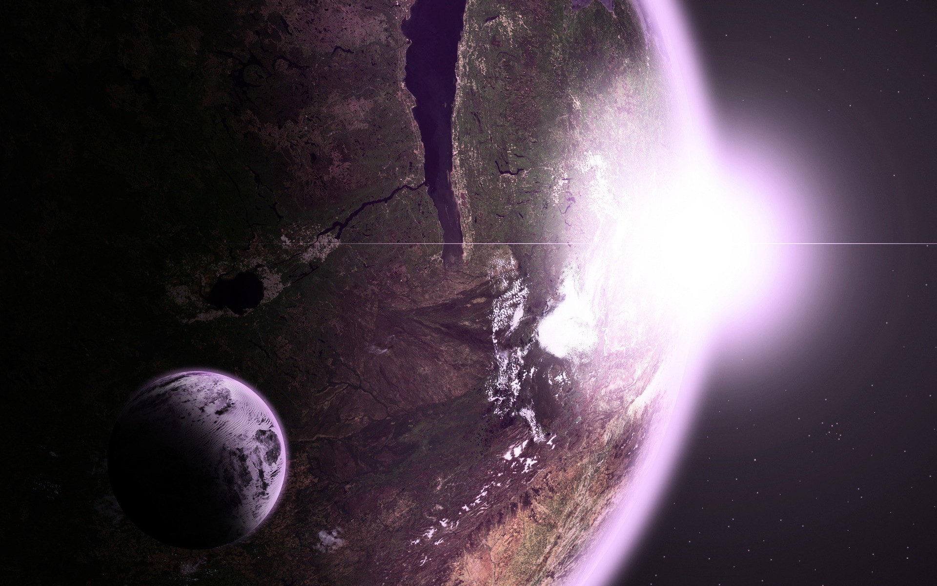 Description: A space station with a large object in the background and a bright light coming from the center of the image.