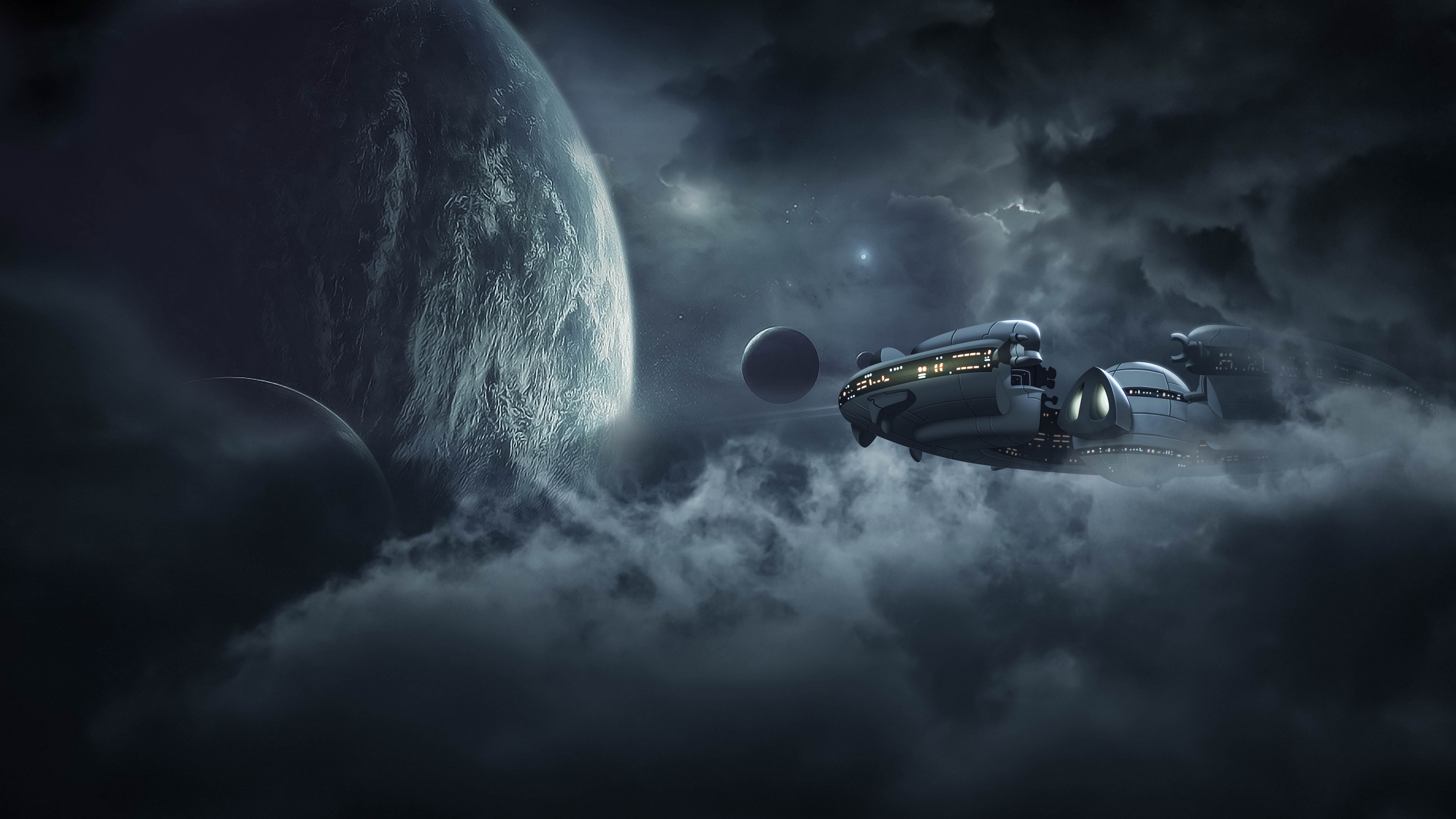 Description: A space station in the clouds with a planet in the background and a distant view of the earth in the distance.