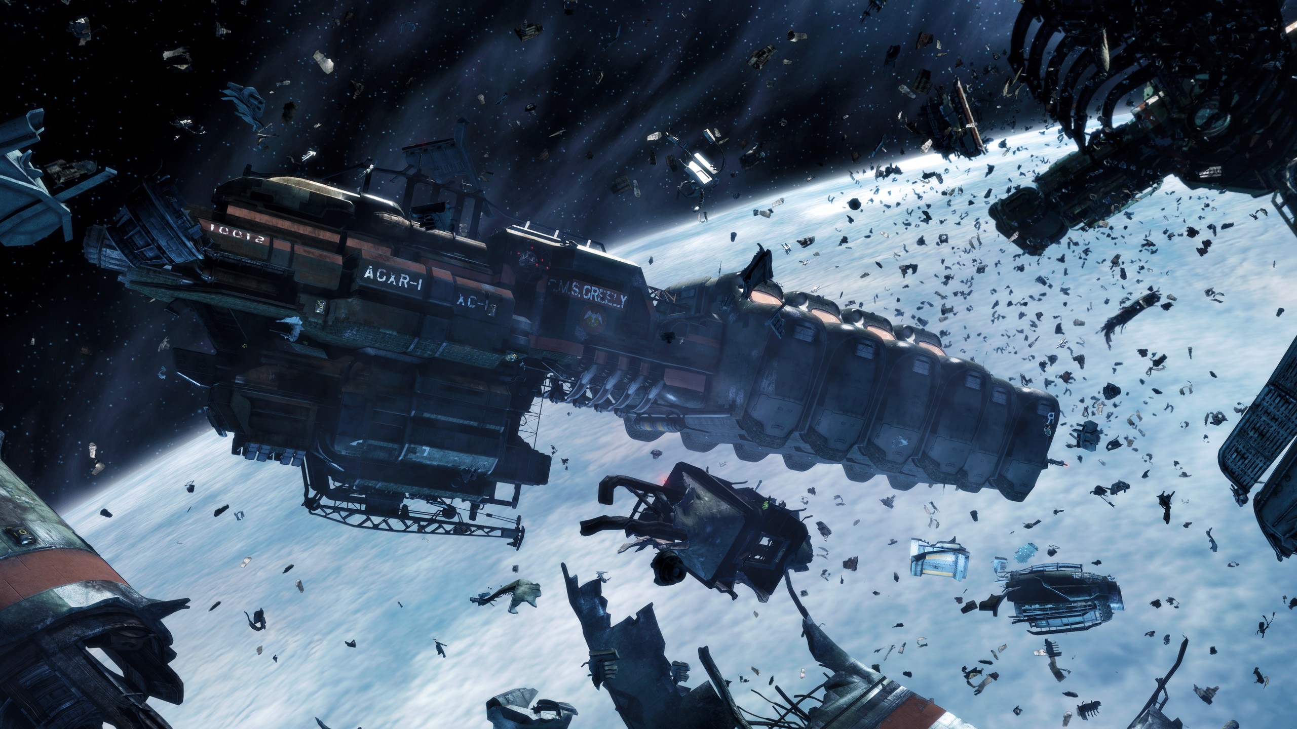 Description: A space station in a sci - fi filthy environment with debris and debris surrounding it and a space station in the background.