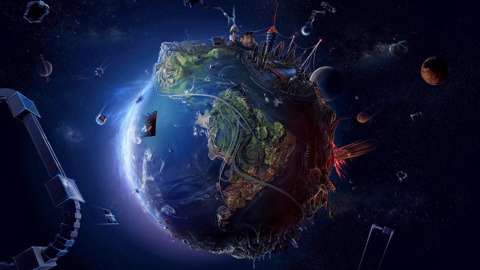 Description: A computer generated image of a space station in the middle of the earth with a satellite system in the background.