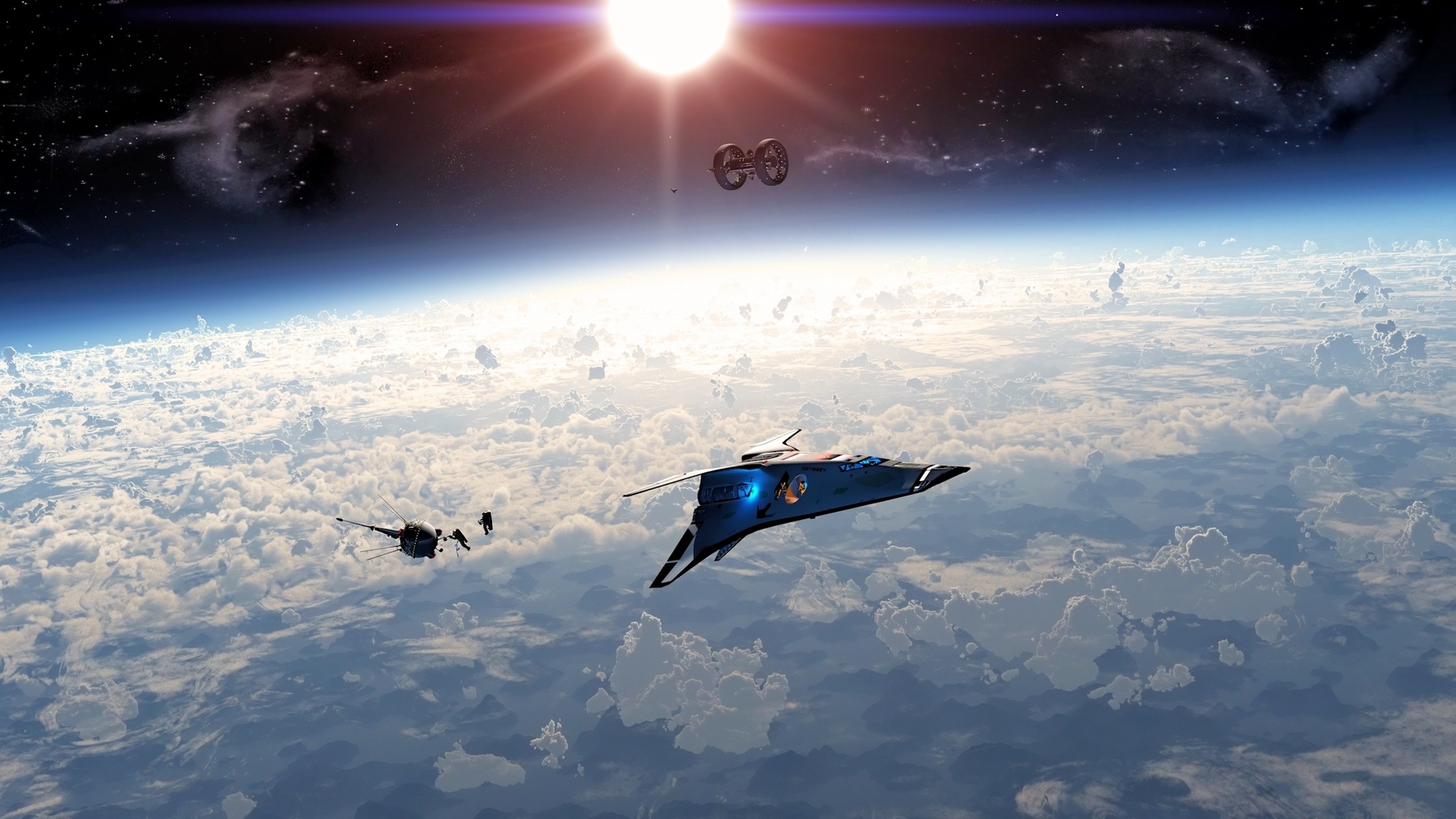 Description: A space station flying over the earth in the sky with a bright sun in the background and a few other objects in the sky.