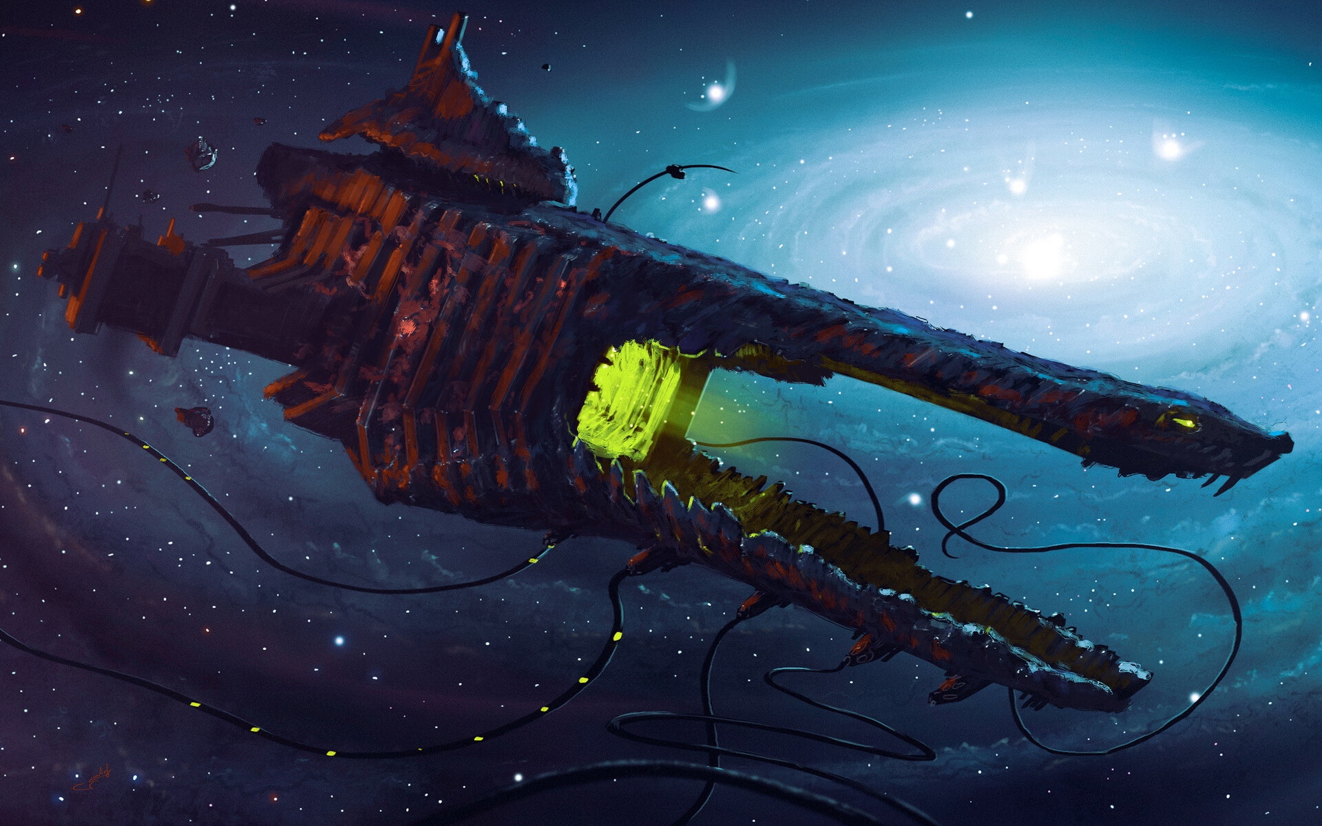 Description: A computer generated image of a space station in the middle of a galaxy with a spiral background and a bright yellow light.