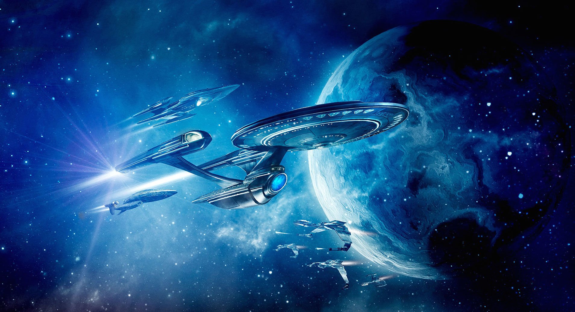 Description: A space station in the middle of a galaxy with a star trek ship in the foreground and a distant planet in the background.