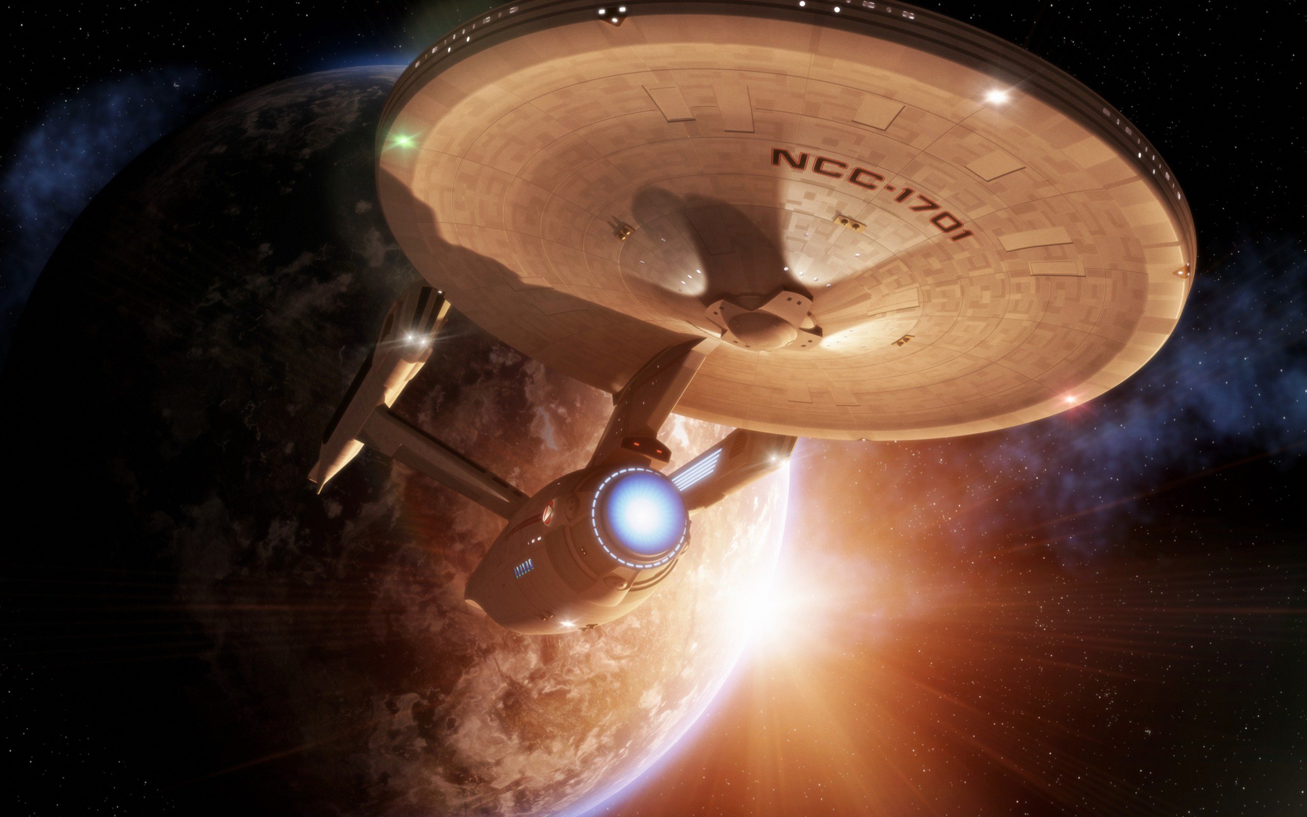 Description: A space station flying over a planet in the sky with a bright light shining on it's side.