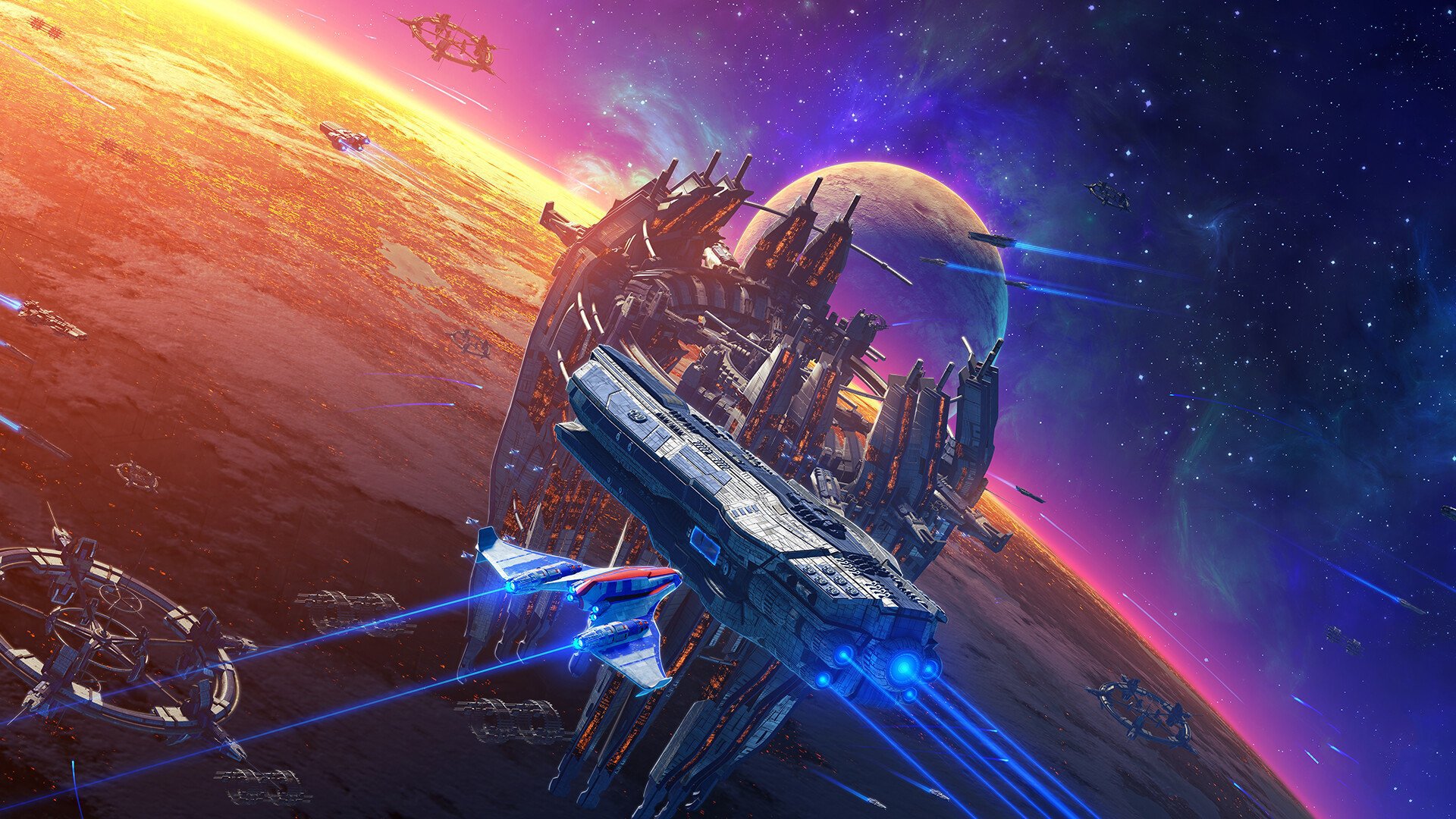 Description: A sci - fi space station in the middle of a space station with a planet in the background and a star trek ship in the foreground.