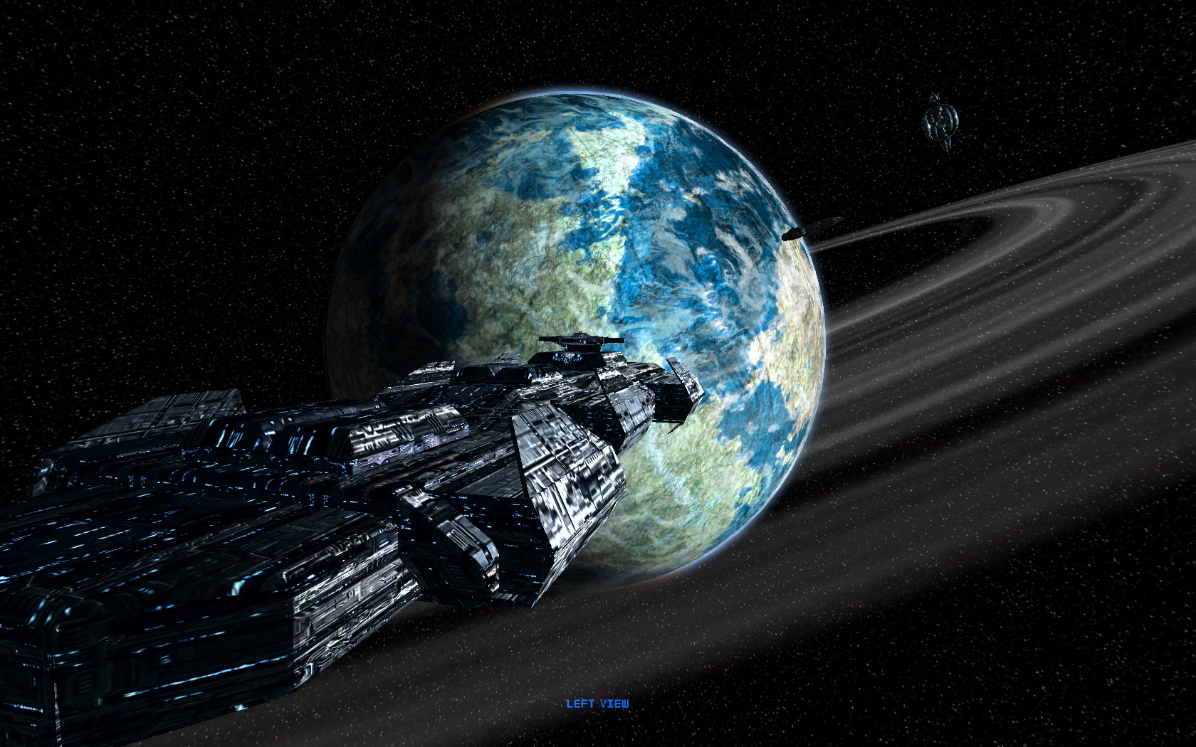 Description: A space station in front of a planet with a ring around it and a star trek vehicle in the foreground.