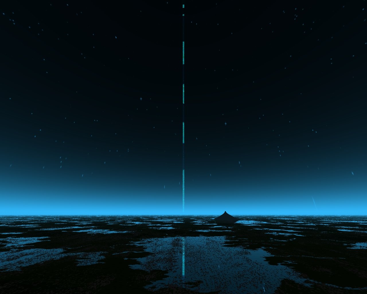 Description: A space station with a rocket on the horizon and a star trail in the sky above it.