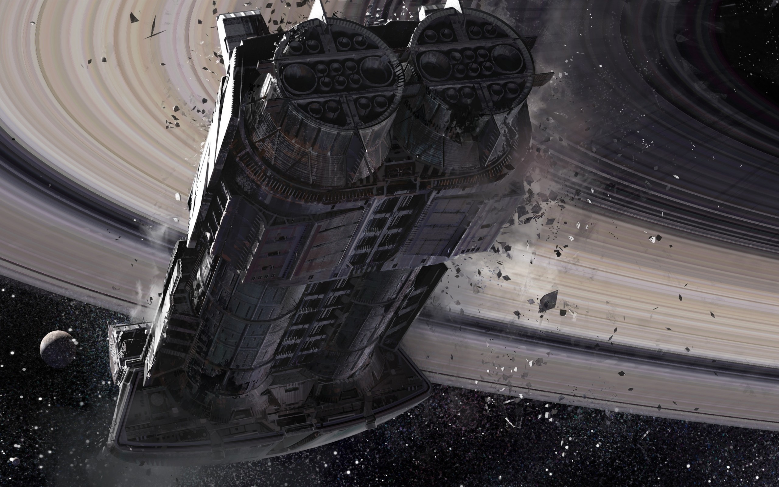 Description: A space station with a spiral background and a star in the sky above it is a saturn like structure.