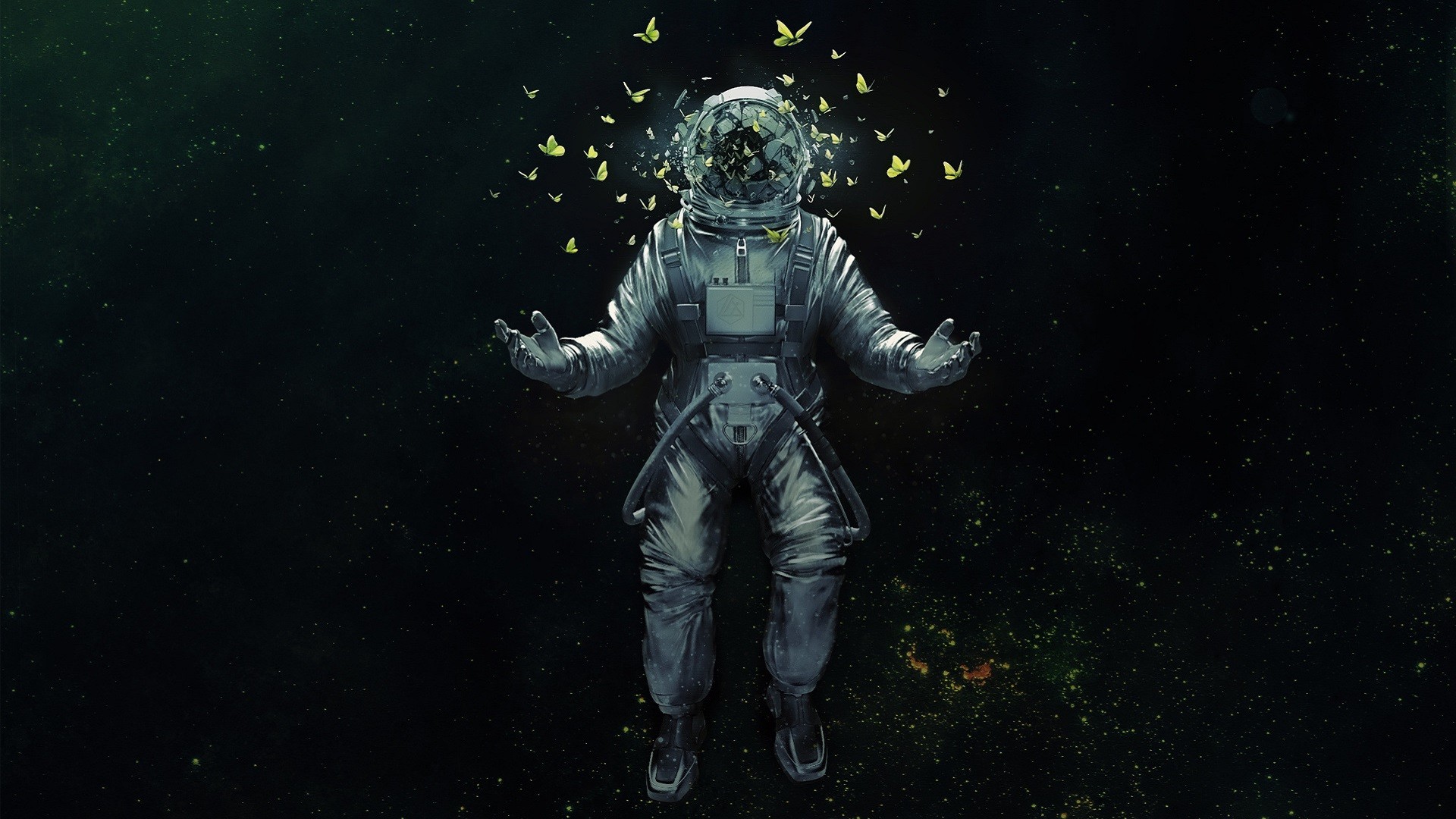Description: A man in a space suit with butterflies flying around him and a butterfly in the air above his head.