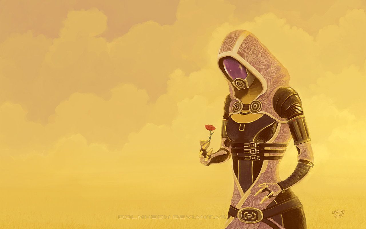 Description: A painting of a person in a space suit holding a flower in one hand and a gun in the other.