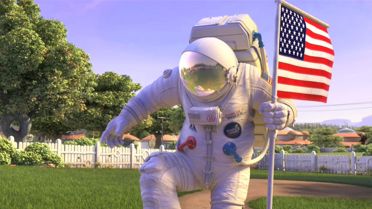 Description: A man in a space suit holding a flag and a pole in a yard with a fence and trees.