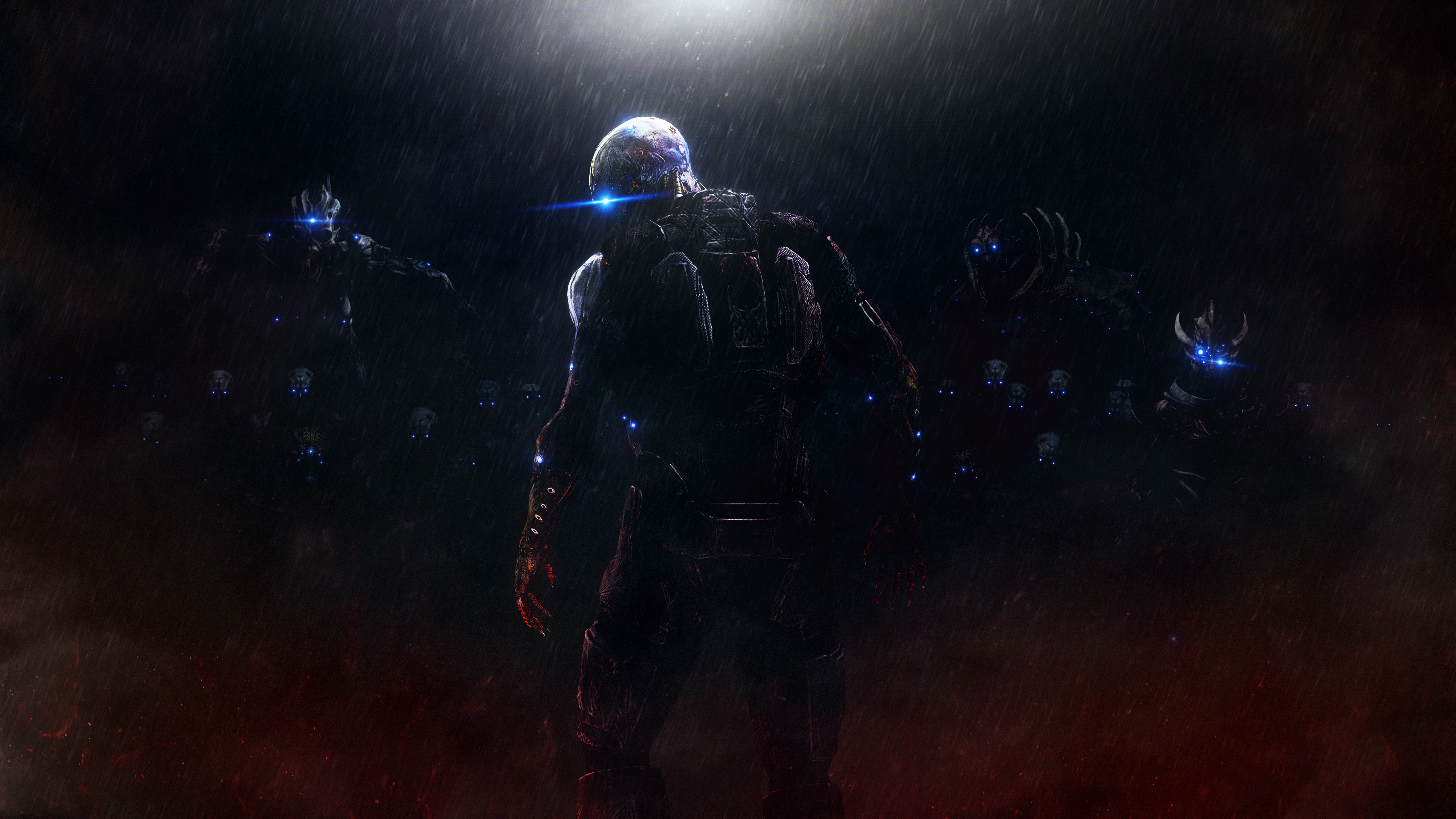 Description: A man in a space suit standing in the rain with a flashlight on his head and a bunch of other people behind him.