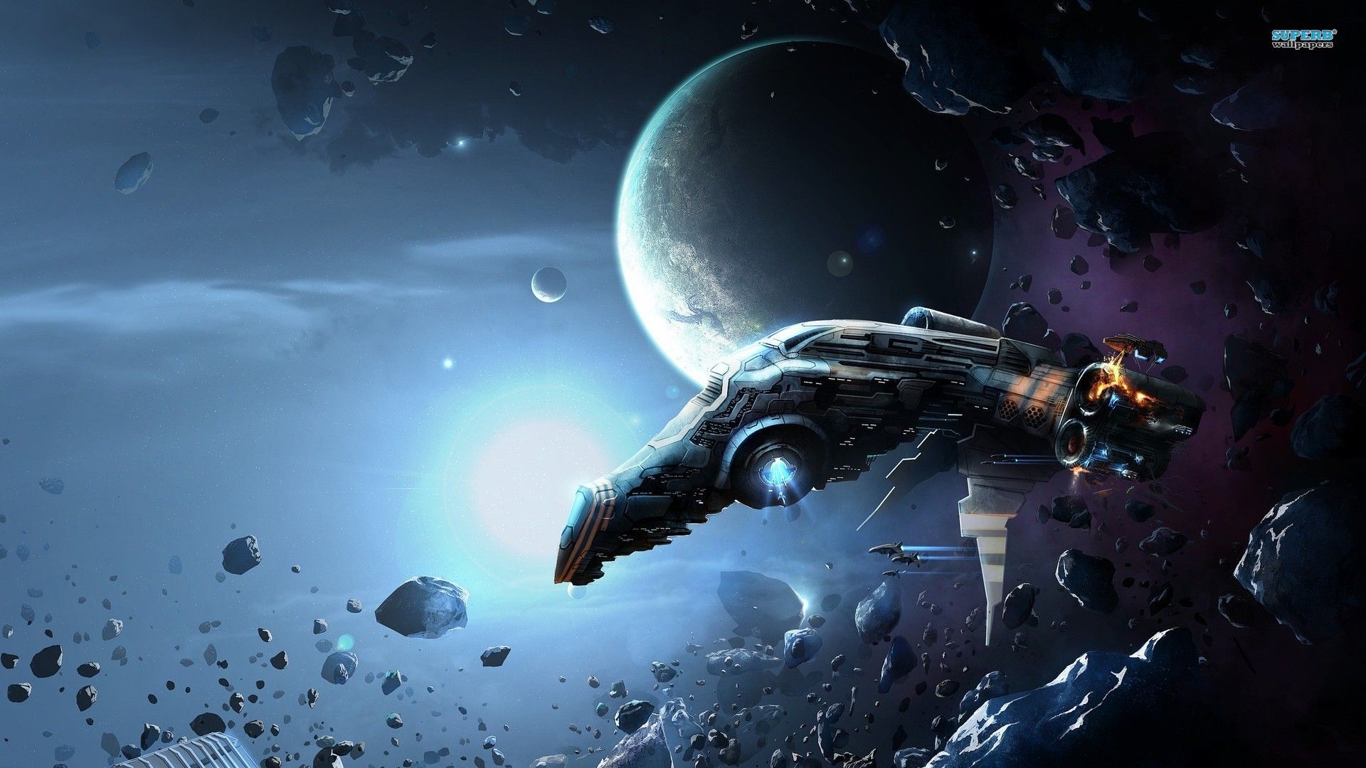 Description: A space ship flying through a rocky space filled with rocks and planets.