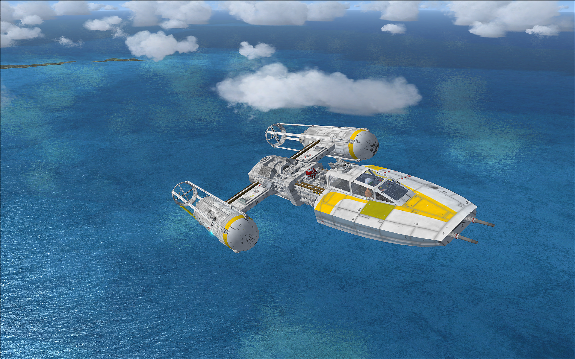 Description: A computer generated image of a space ship floating in the ocean with clouds in the background and a yellow and white stripe on the side.