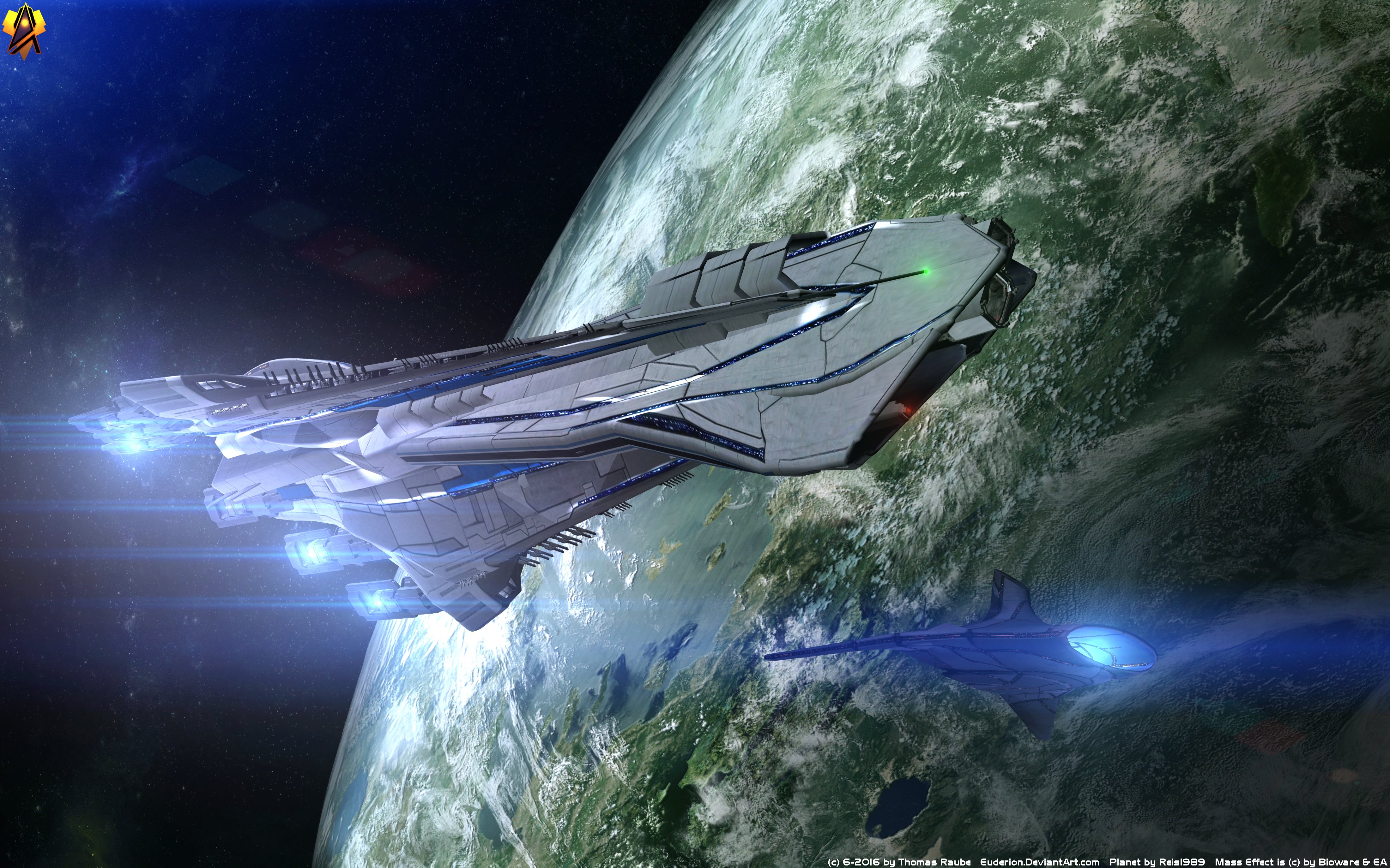 Description: A space ship flying over a green planet in space with a blue light coming from its side and a blue light coming from its side.