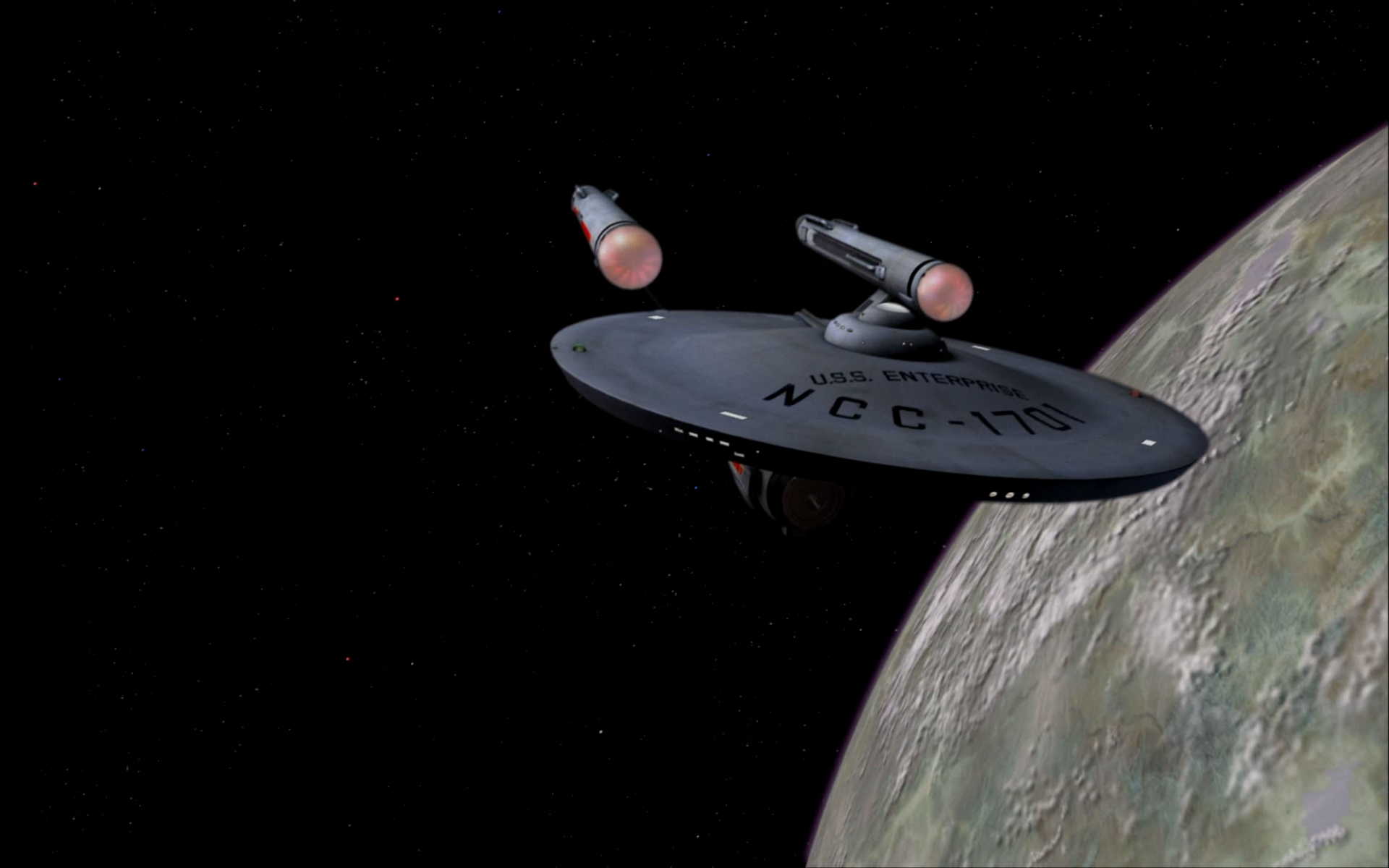 Description: A space ship flying over a planet in the sky with a moon in the background and a red light on the top of the ship.