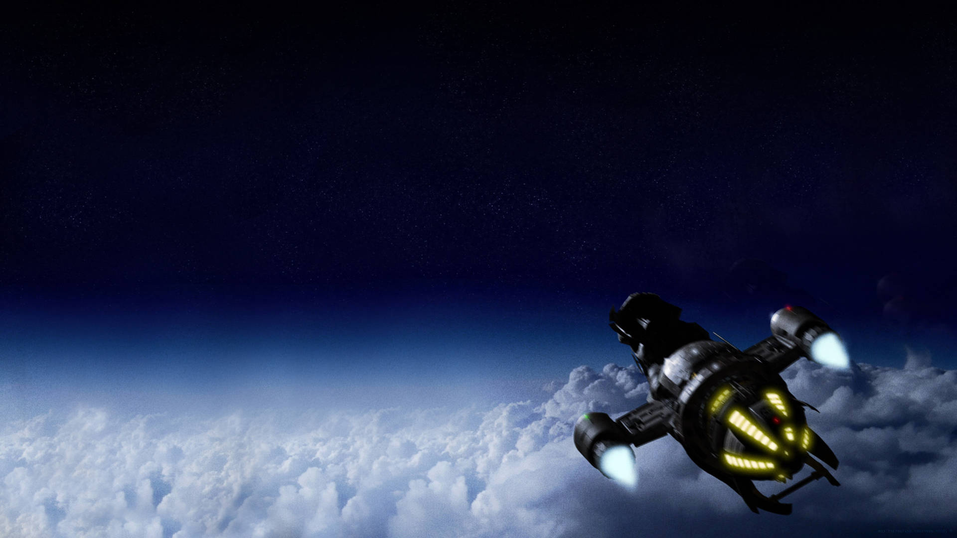 Description: A space ship flying through the sky above clouds and stars in the night sky with a bright light on the side of the plane.