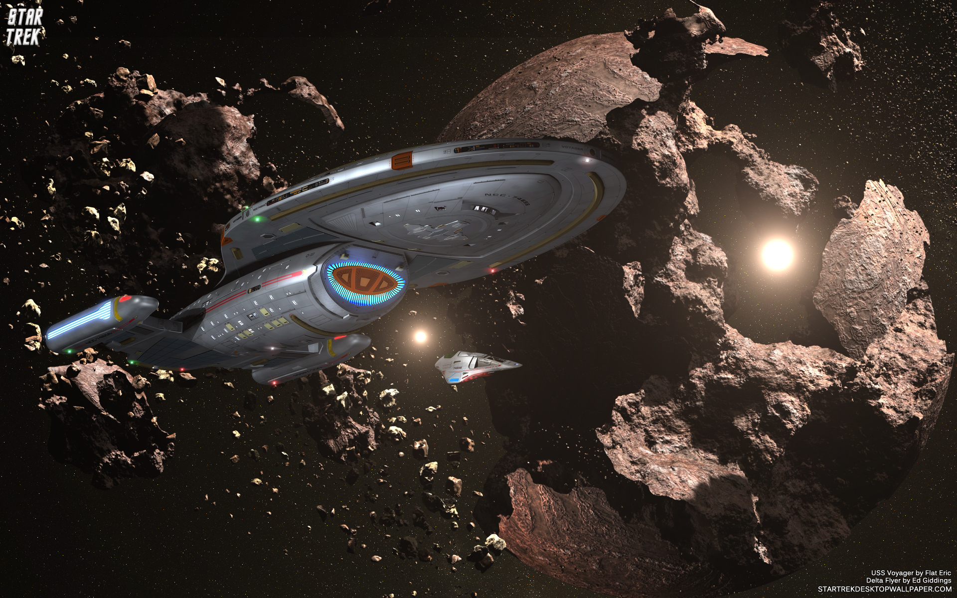 Description: A space ship flying over a rocky surface in space with a bright light on it's side and a distant object in the background.
