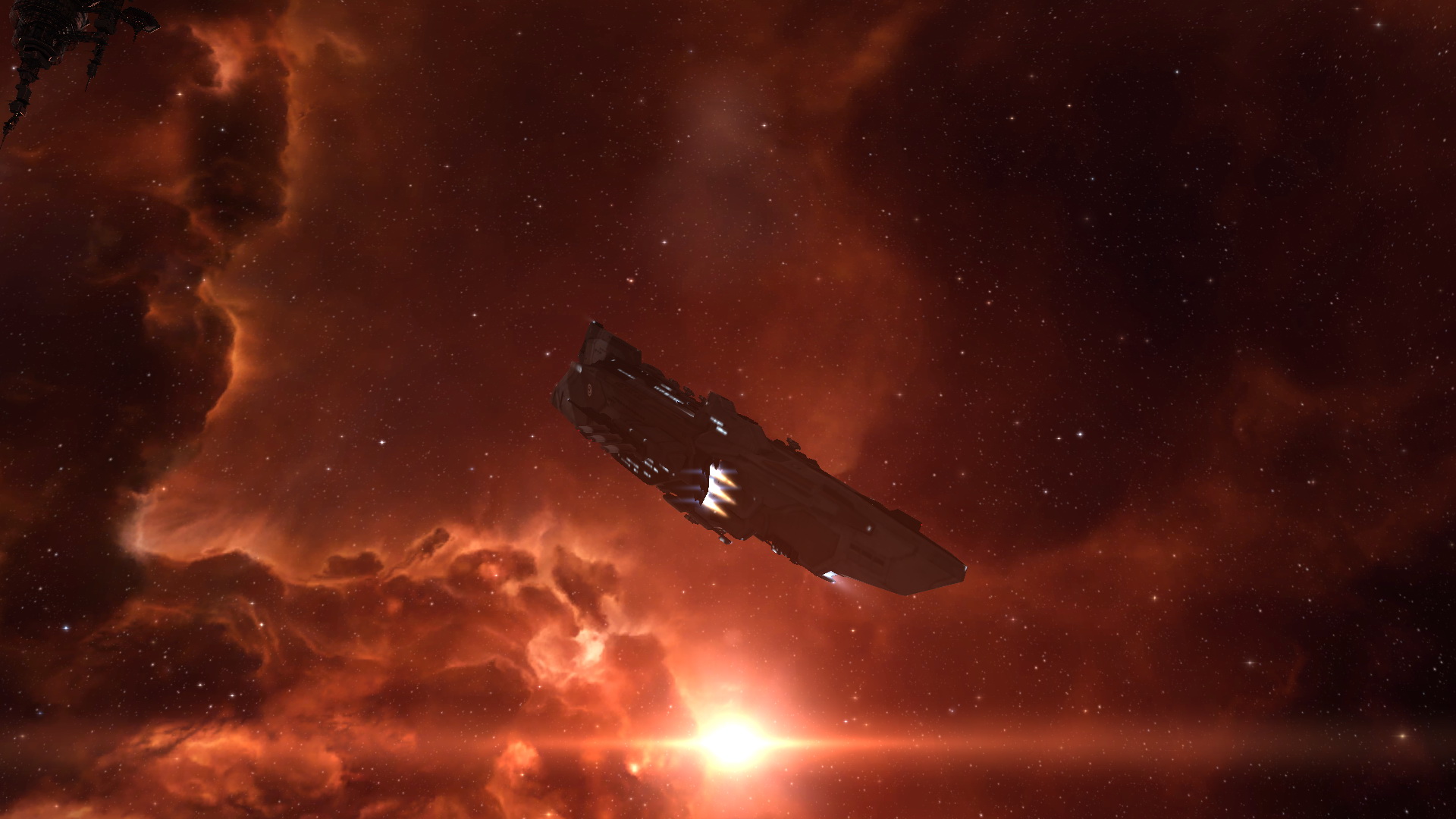 Description: A space ship flying through a star filled sky with a bright light behind it and a star in the distance.