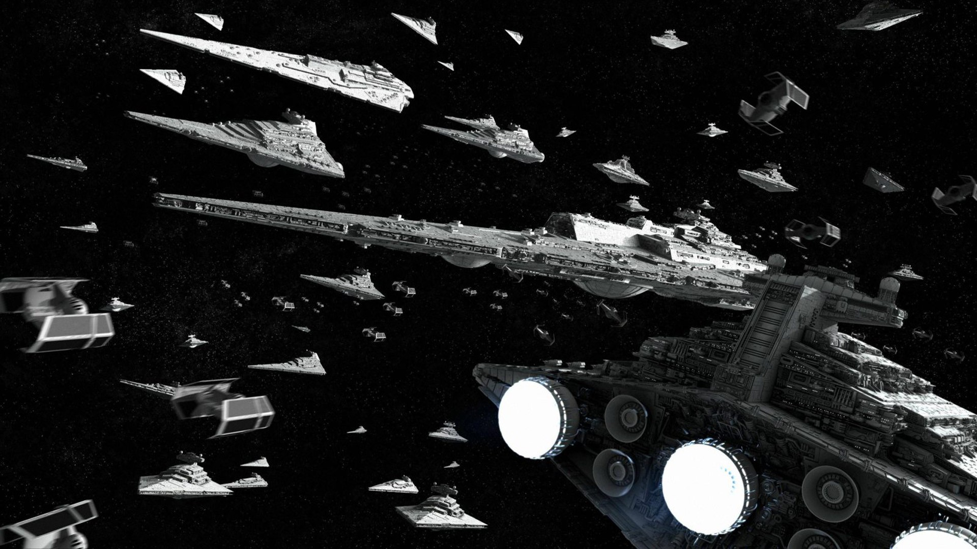 Description: A bunch of spaceships flying through the air with lights on them and a star destroyer in the background.
