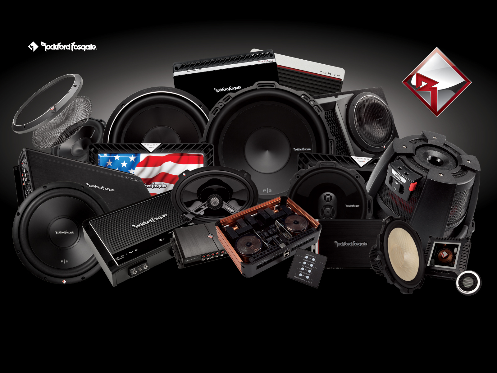 Description: A pile of speakers and other electronics on a black background with a red and white diamond logo on the top.