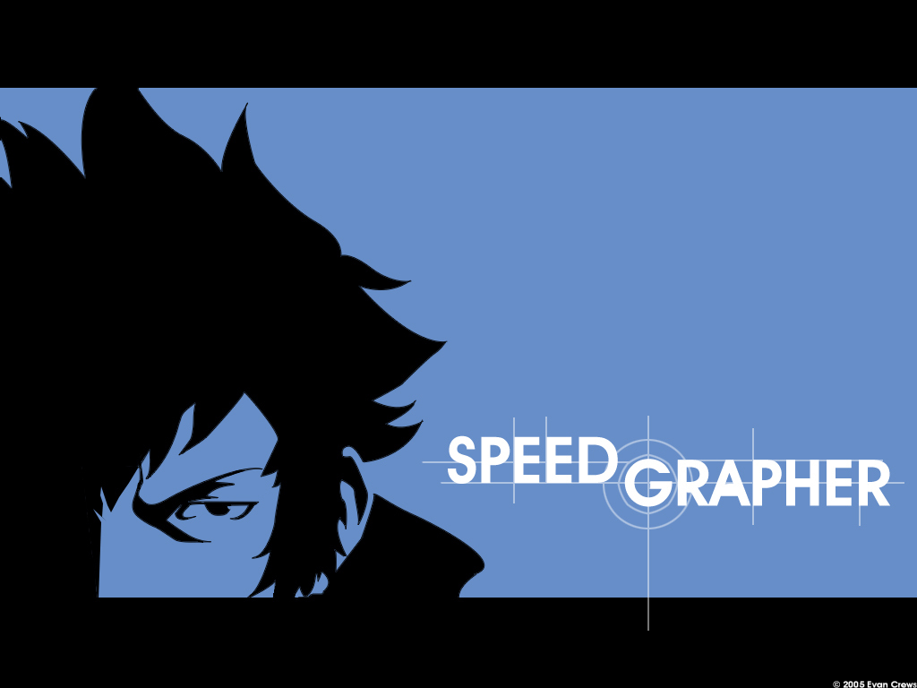 Description: A graphic of a man with a gun in his hand and the words speed grapher on it in front of him.