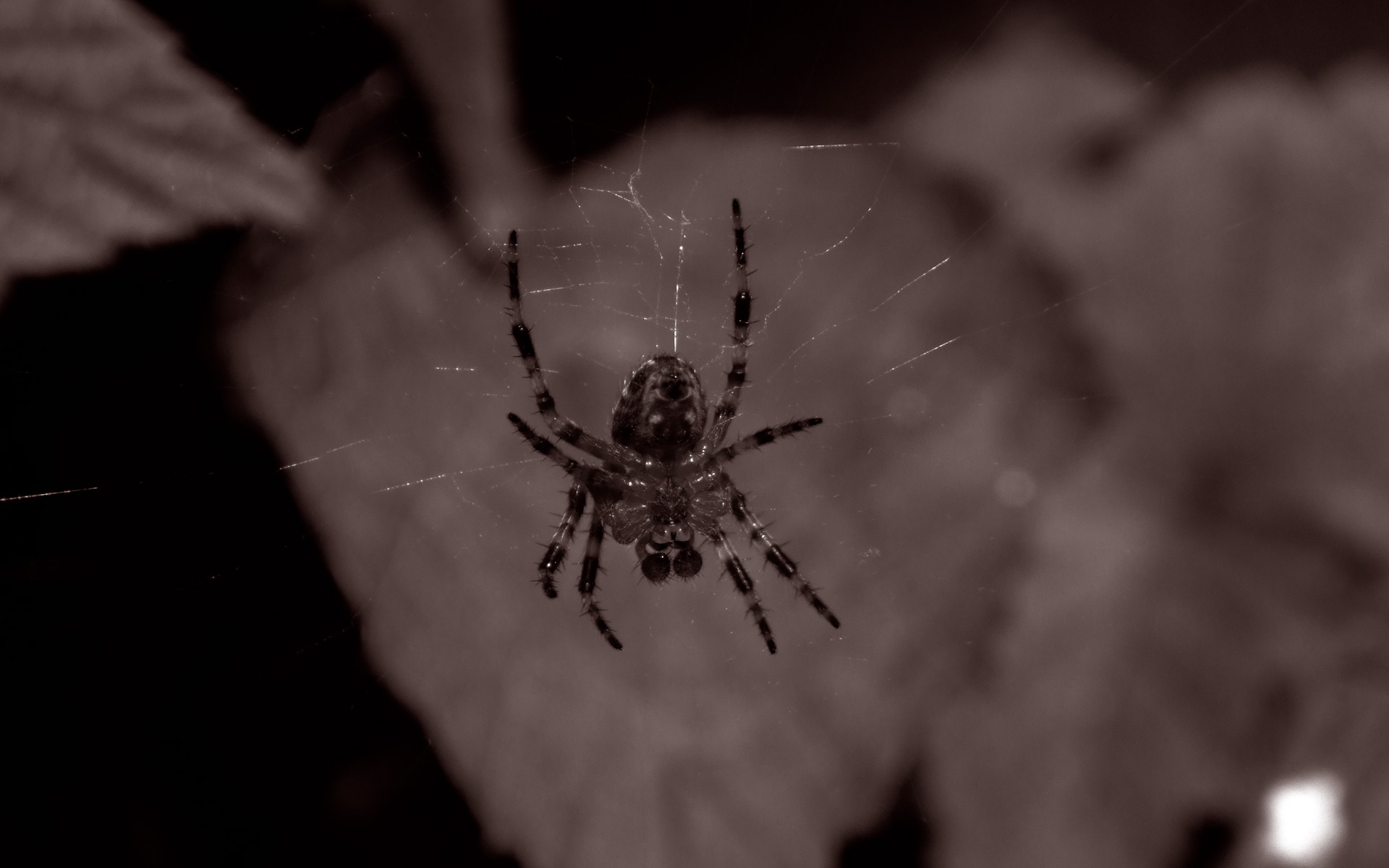Description: A spider is sitting on a flower in a dark room with a blurry background of leaves and flowers.