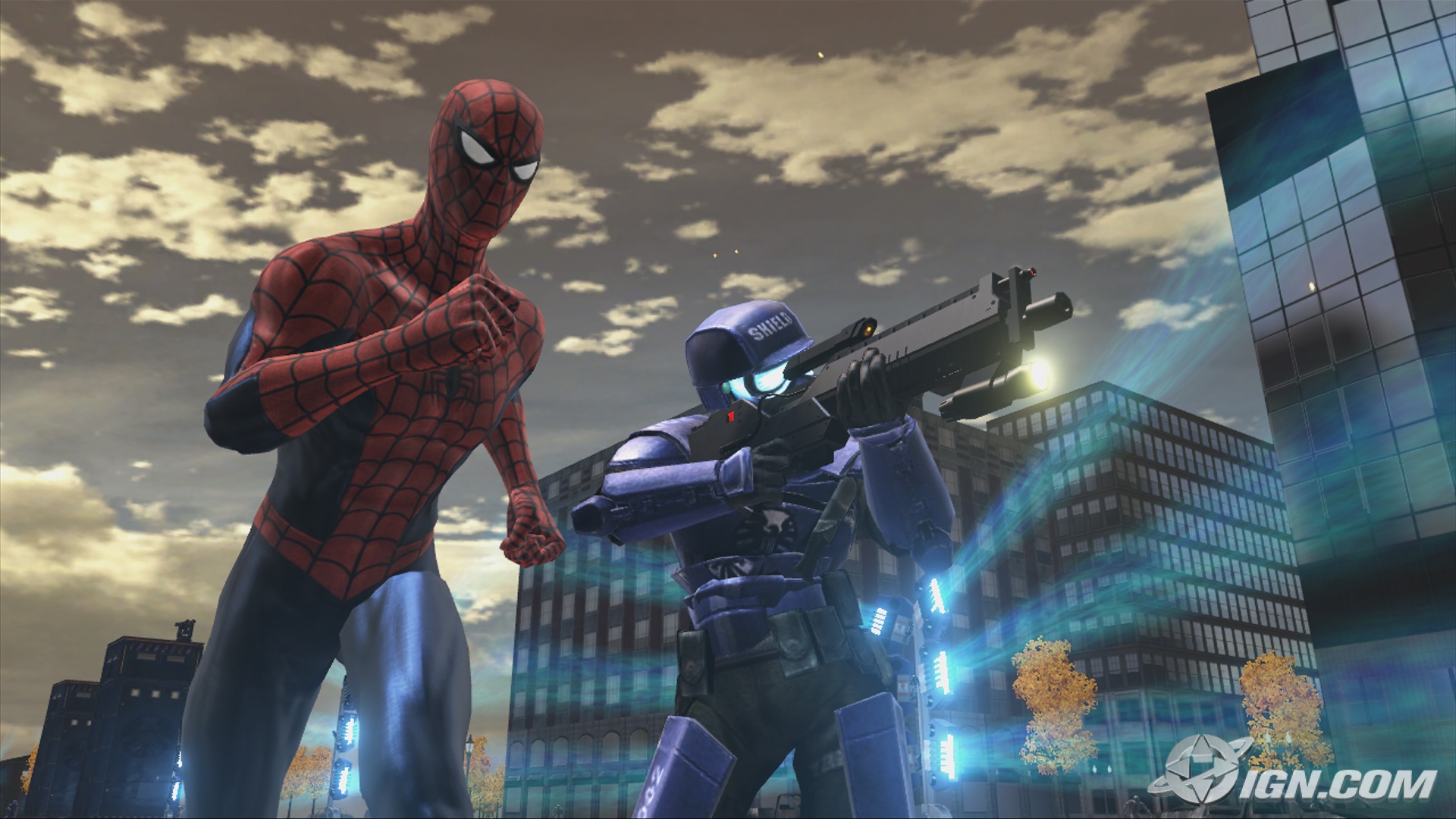 Description: A spider man and a robot are in a city setting with a gun in his hand and a building in the background.