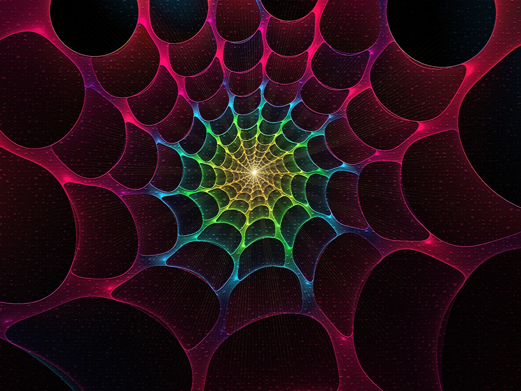 Description: A computer generated image of a spider web design with a bright center surrounded by smaller circles and dots of light.