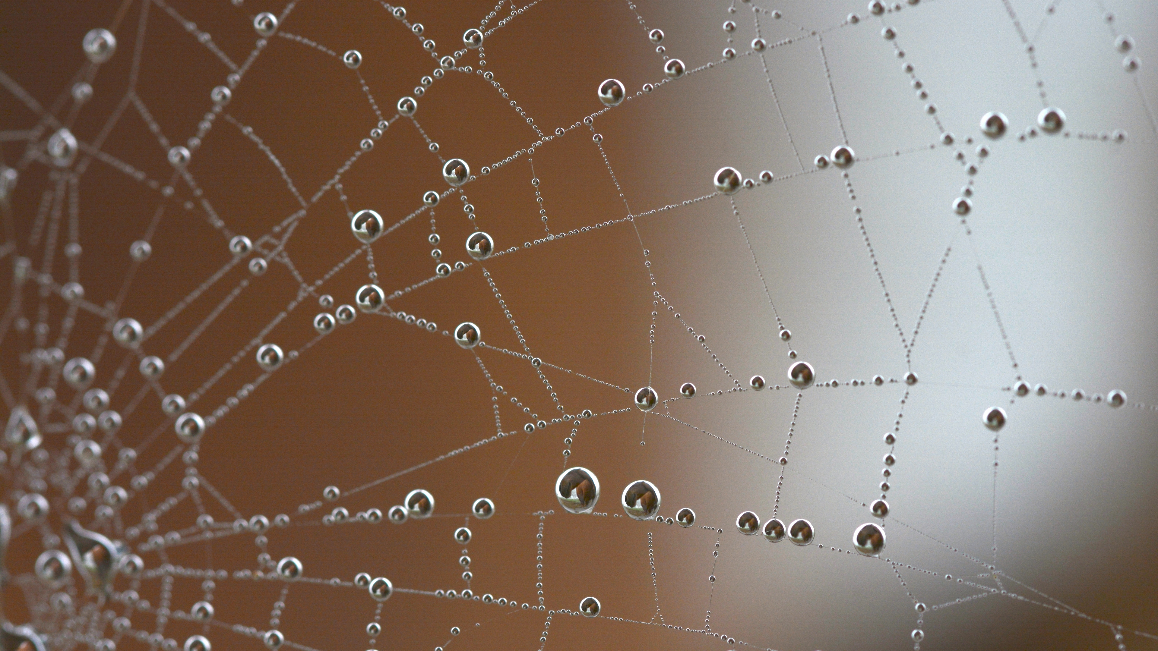 Description: A spider web with water drops on it's webs and a brown background with a few other drops of water on it.