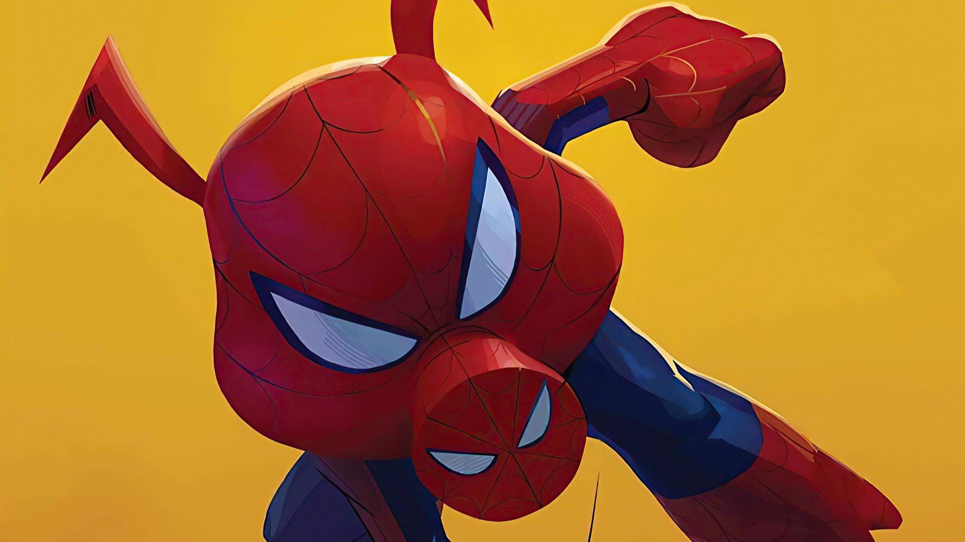 Description: A spider man flying through the air with his arms out and eyes wide open.