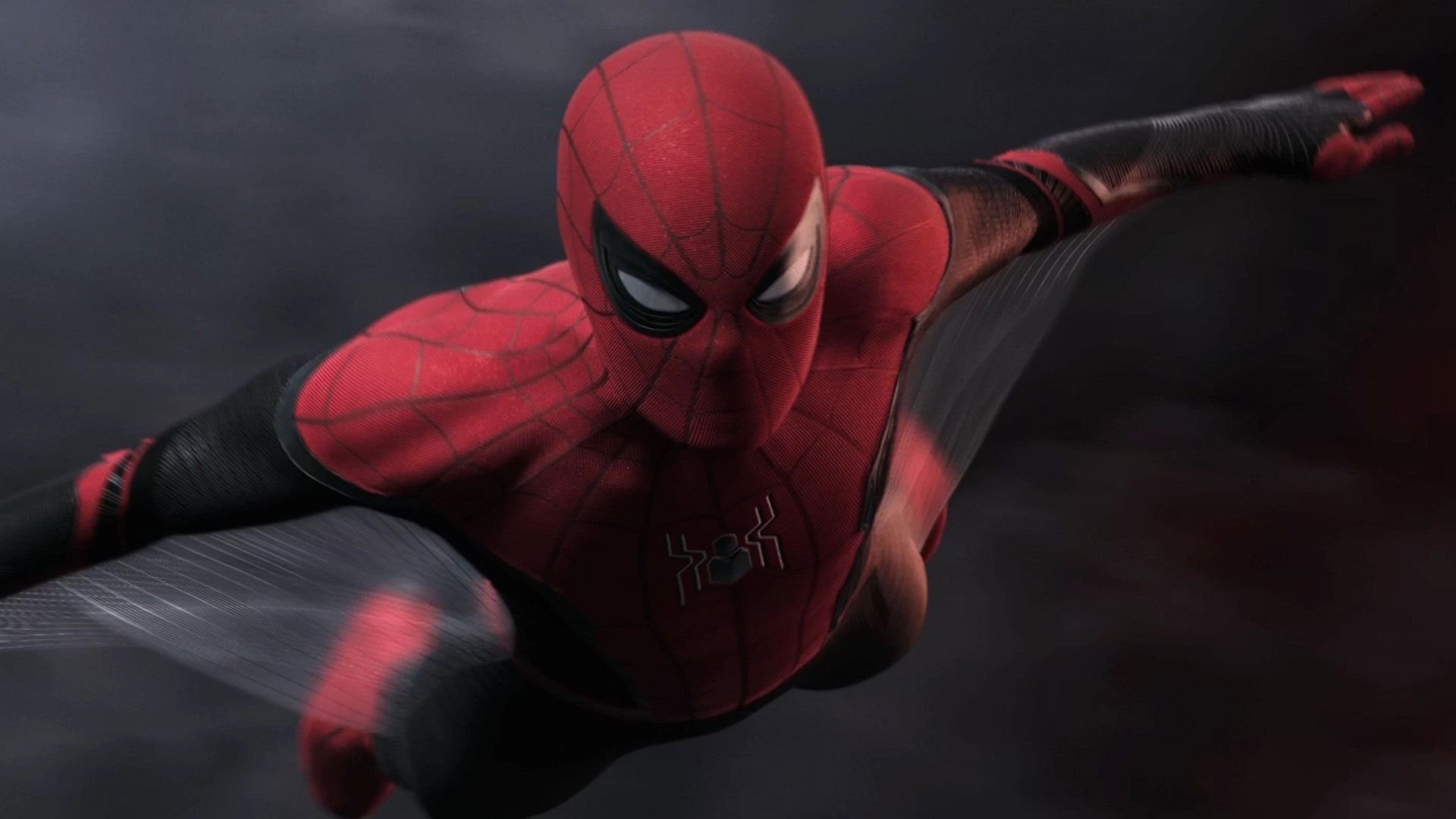 Description: A spider - man in a red suit is flying through the air with his arms outstretched and his eyes closed.