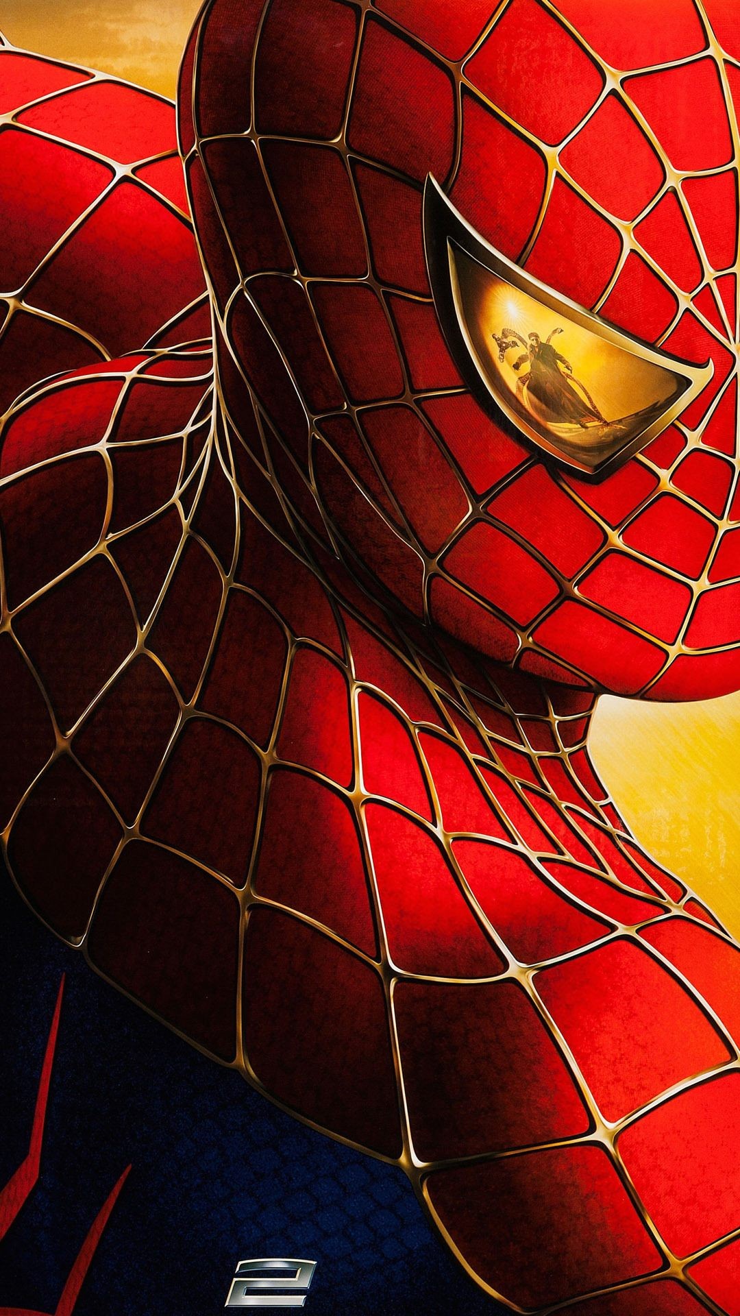 Description: A close up of a spider man with a yellow background and a red and blue suit with a yellow light.