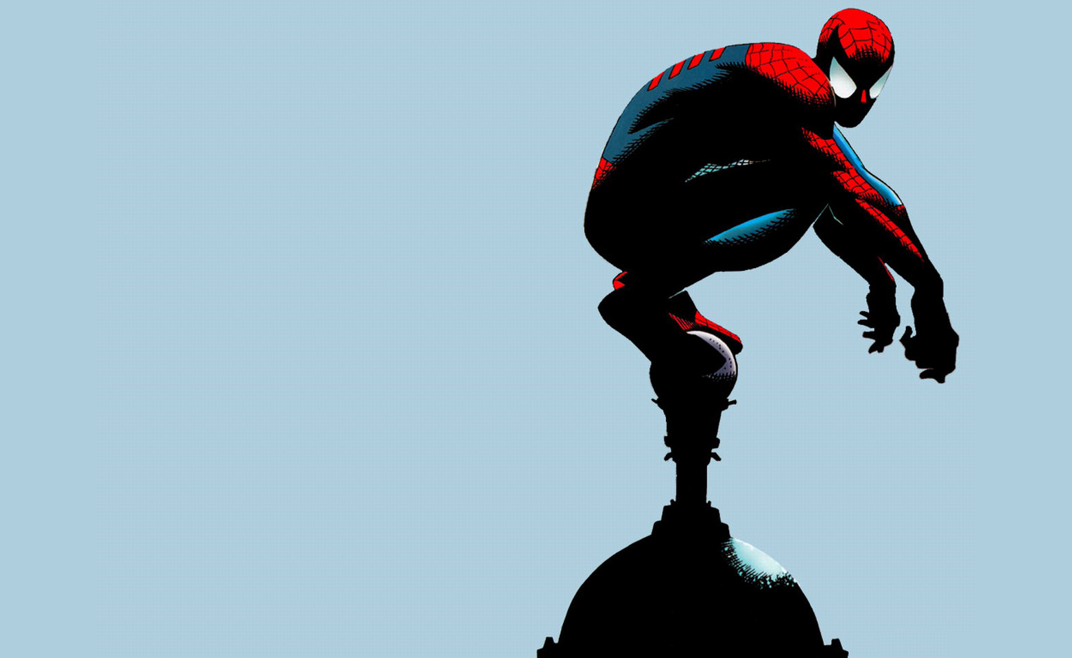 Description: A spider man is jumping over a building top in the air with his hands in his pockets and his legs in the air.