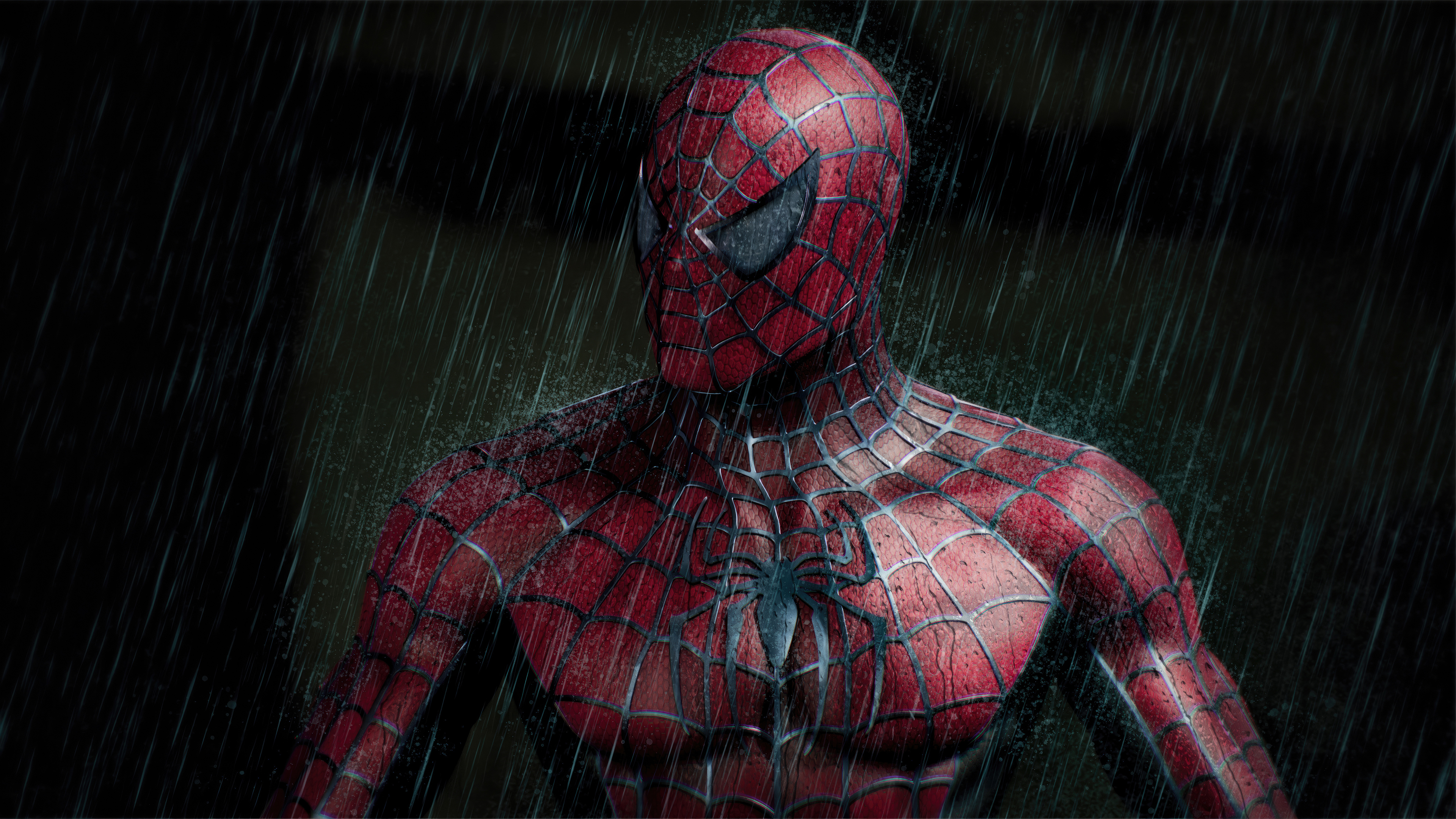 Description: A spider man standing in the rain with his hands on his hips and his face covered by a spider - man mask.