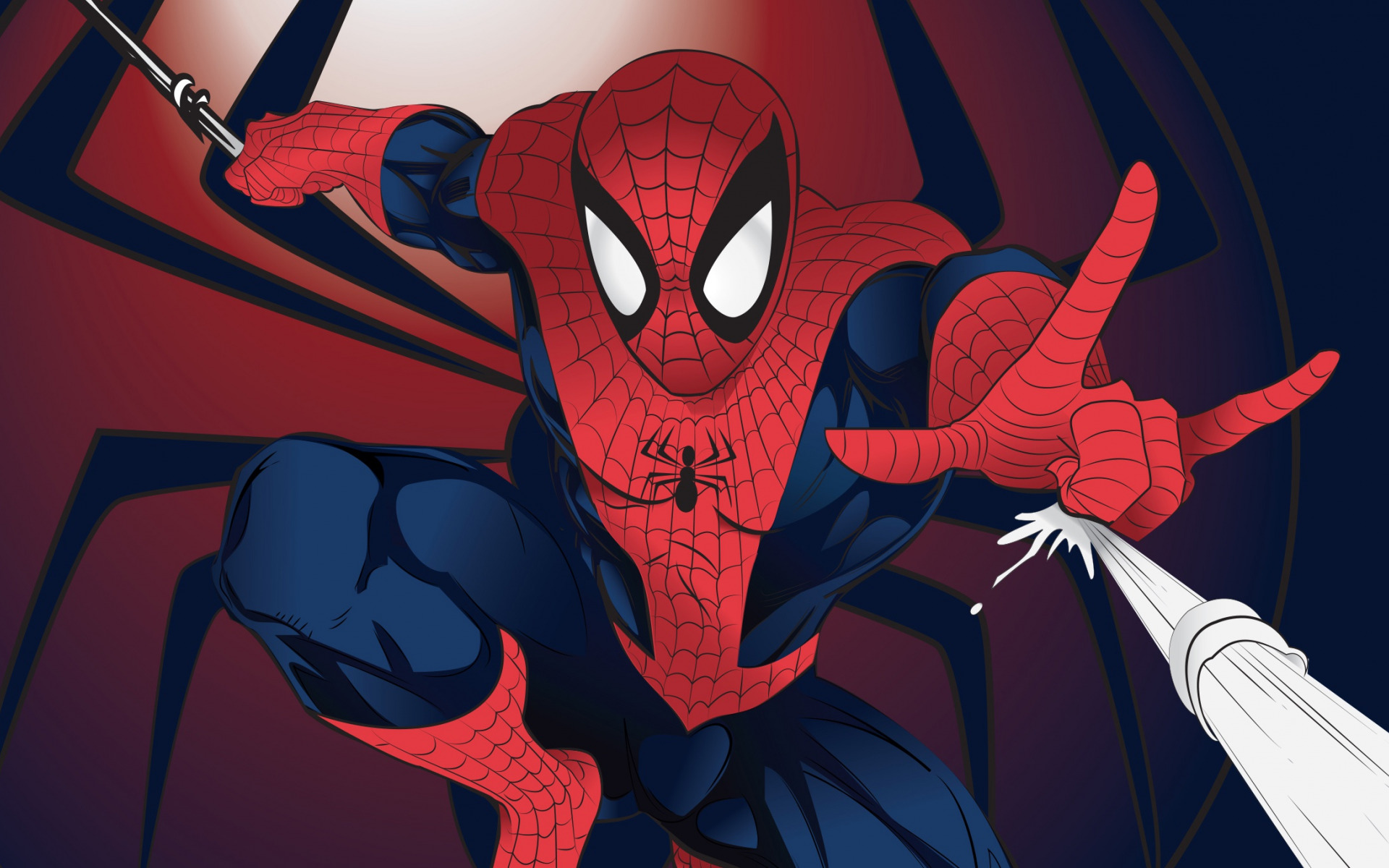 Description: A spider man is holding a sword and pointing at something in the air with his right hand and his left hand.