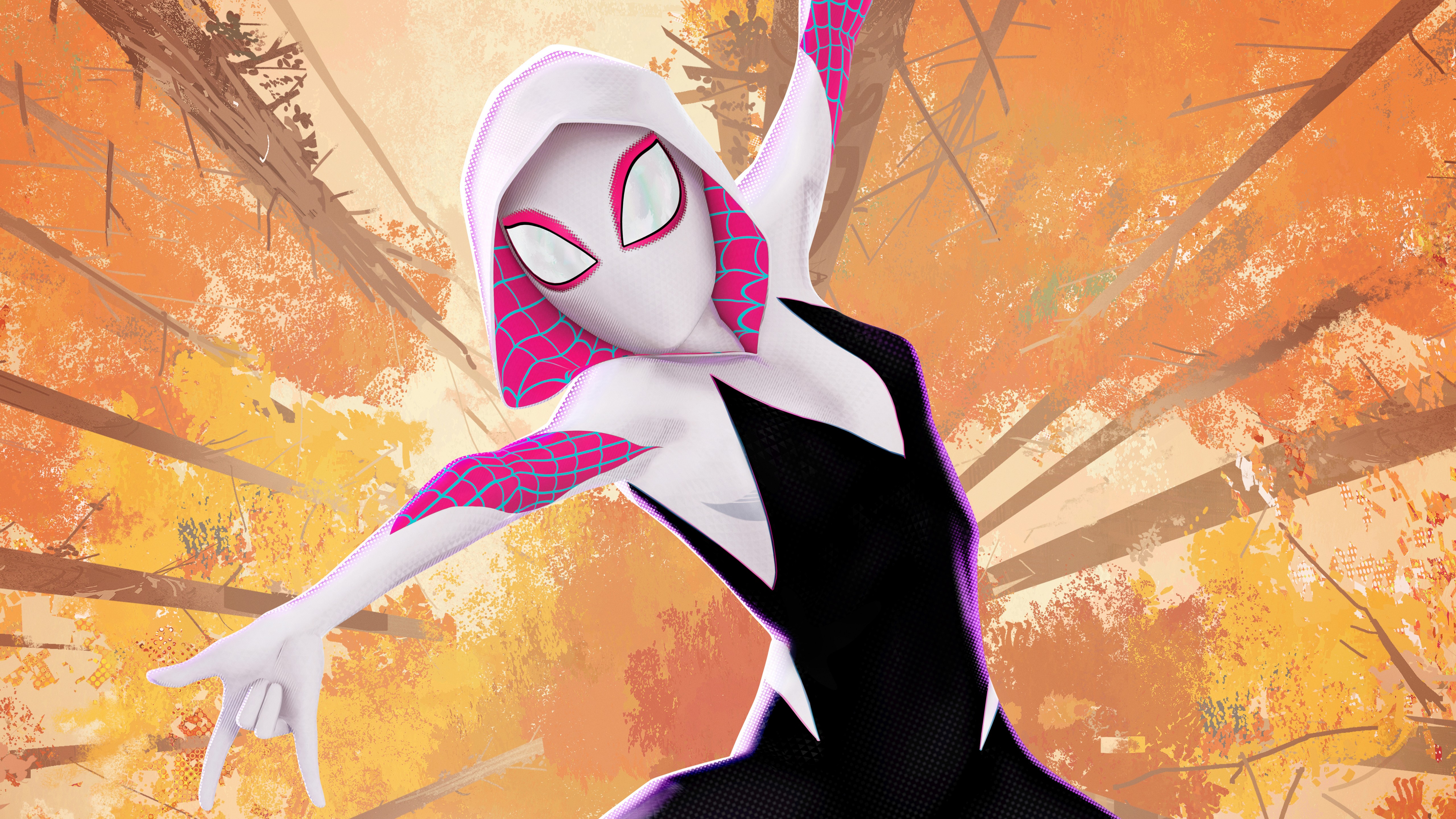 Description: A cartoon spider woman with a black dress and pink and white spider webs on her arms and legs.