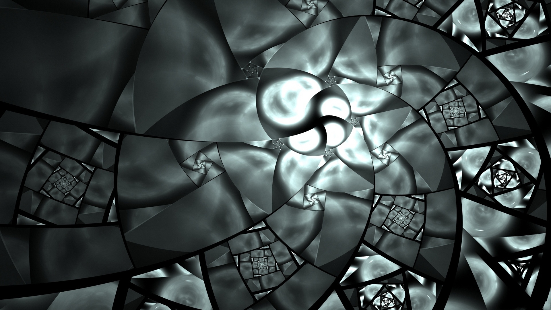 Description: A black and white photo of a spiral design with a light in the middle of it and a circular object in the middle.