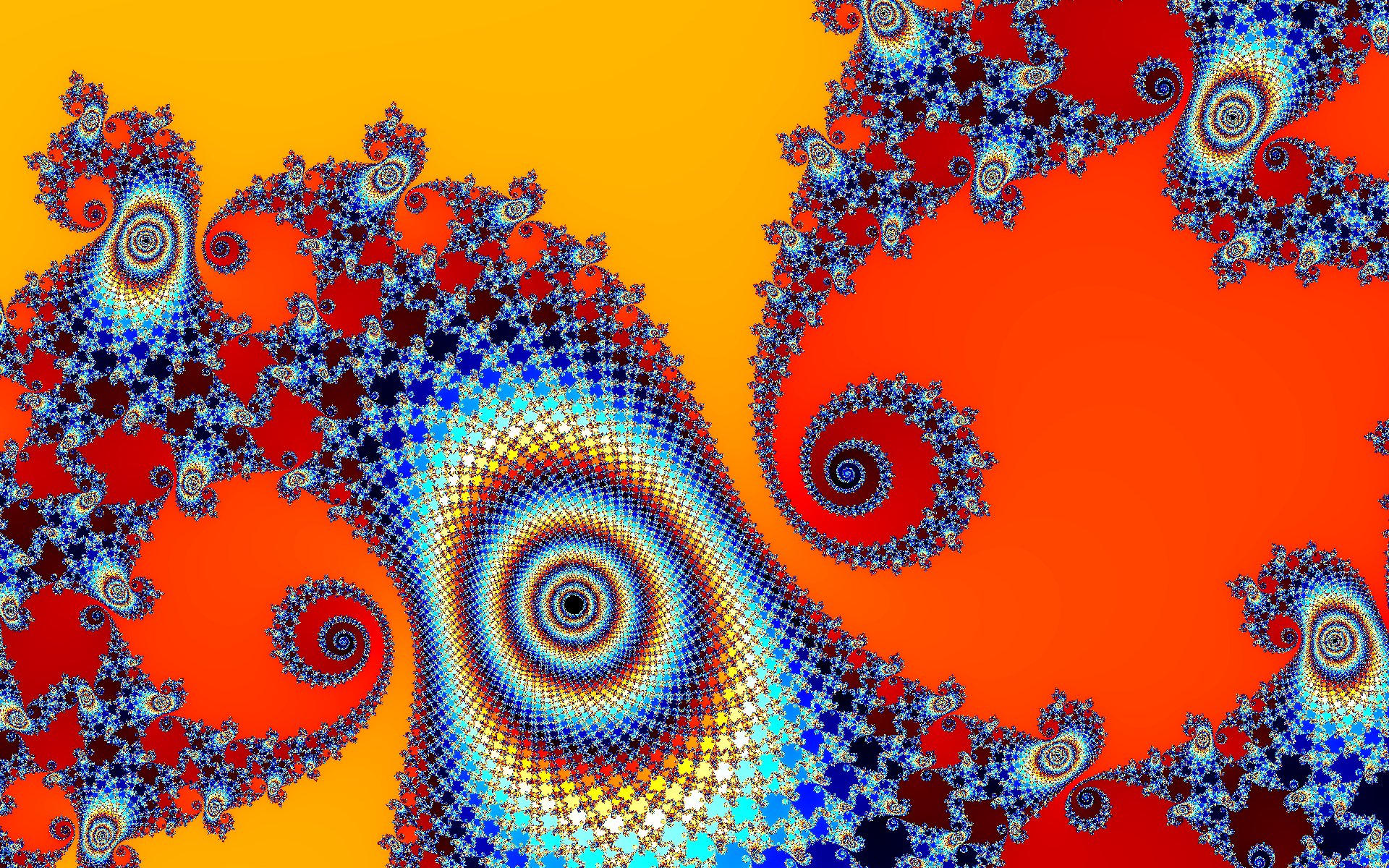 Description: A computer generated image of a spiral design on an orange background with blue and red colors and a black center.