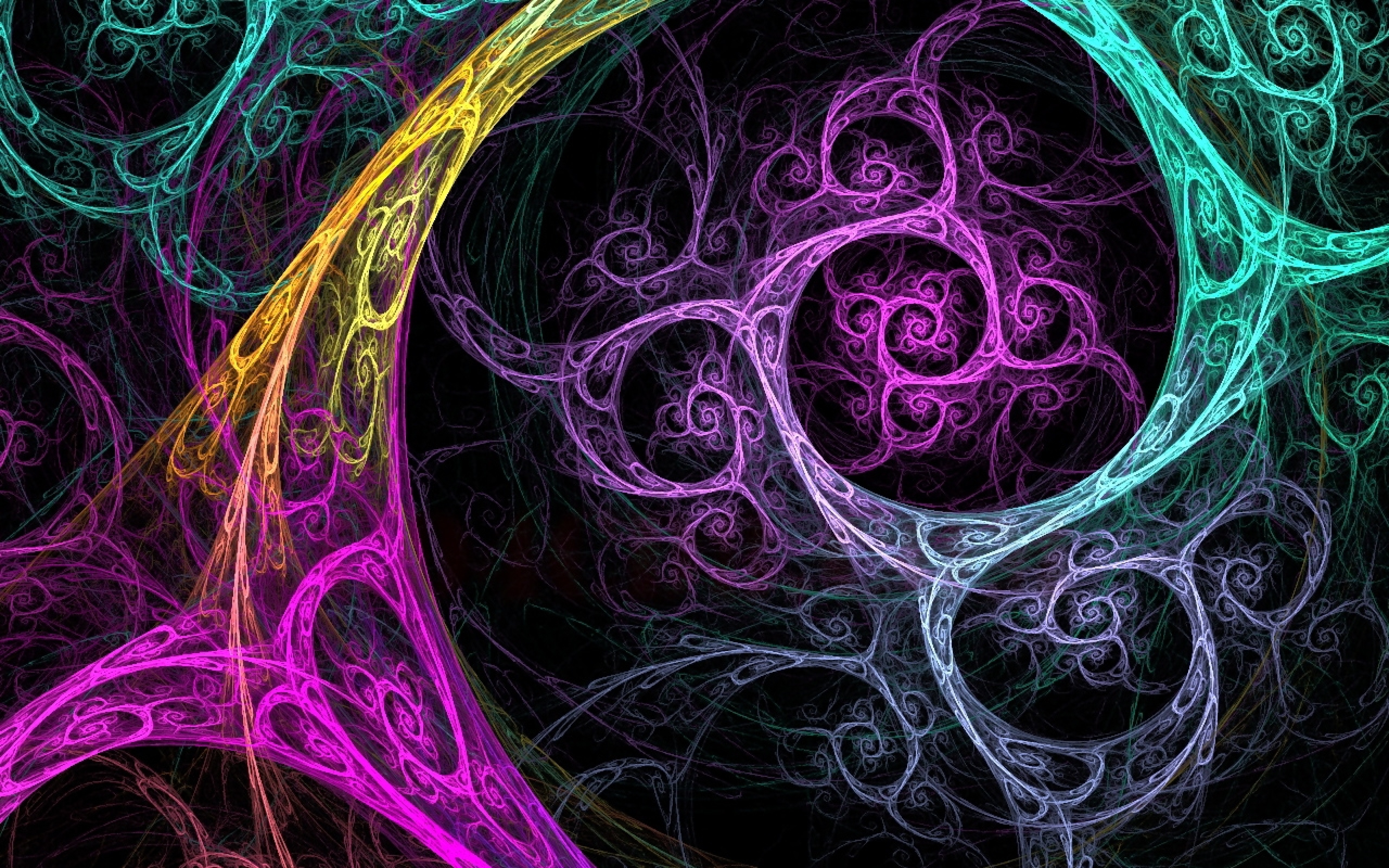 Description: A computer generated image of a spiral design in purple and green colors with a black background and a yellow center.
