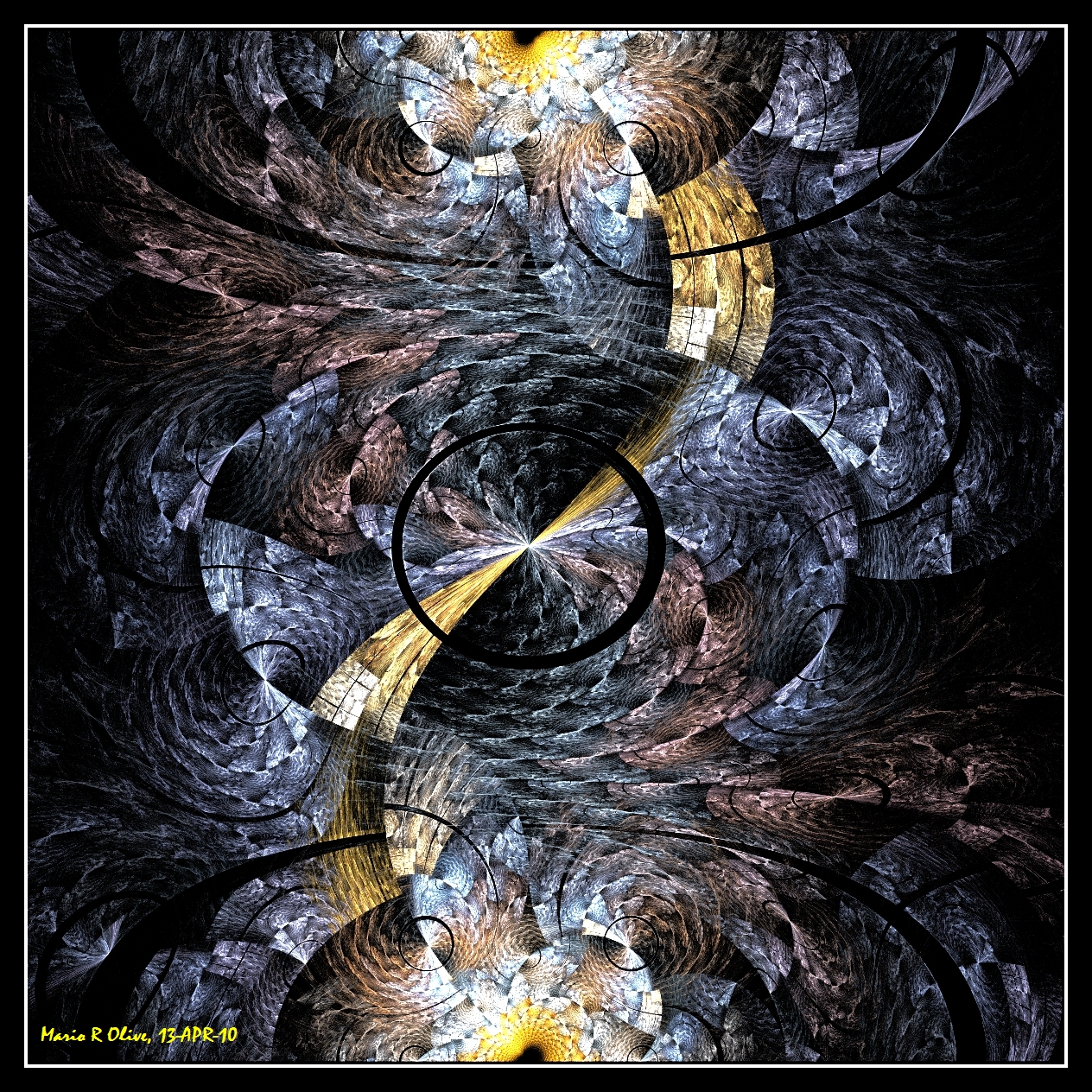 Description: A computer generated image of a spiral design with a yellow center and a black center and a white center.