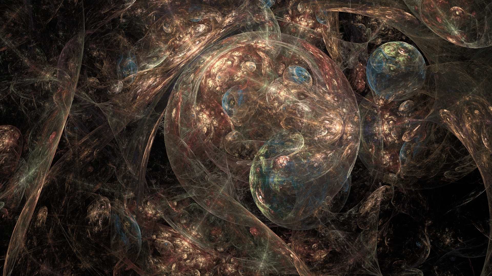Description: A computer generated image of a spiral of flowers and leaves in brown and blue colors with a black background.