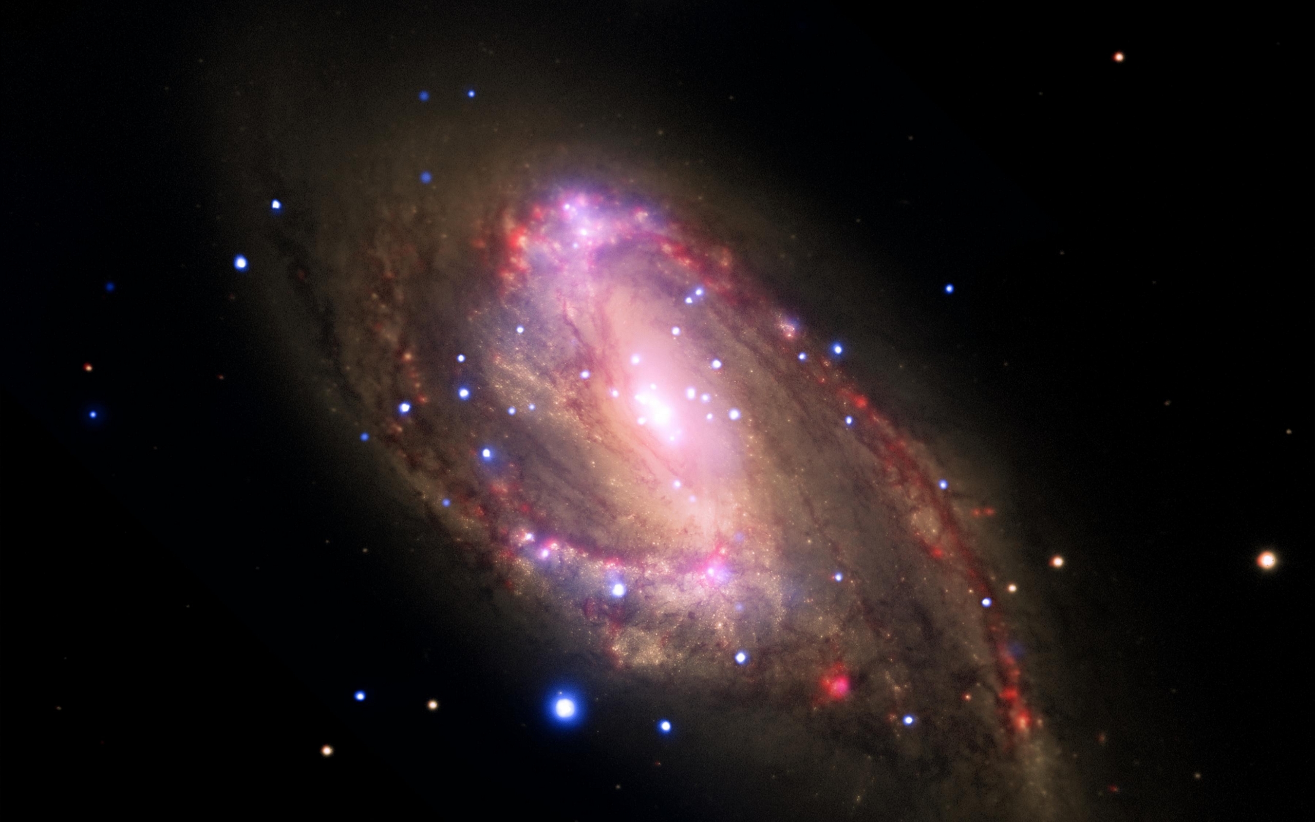 Description: A very large spiral shaped object in the sky with stars around it and a bright light shining on the side of it.