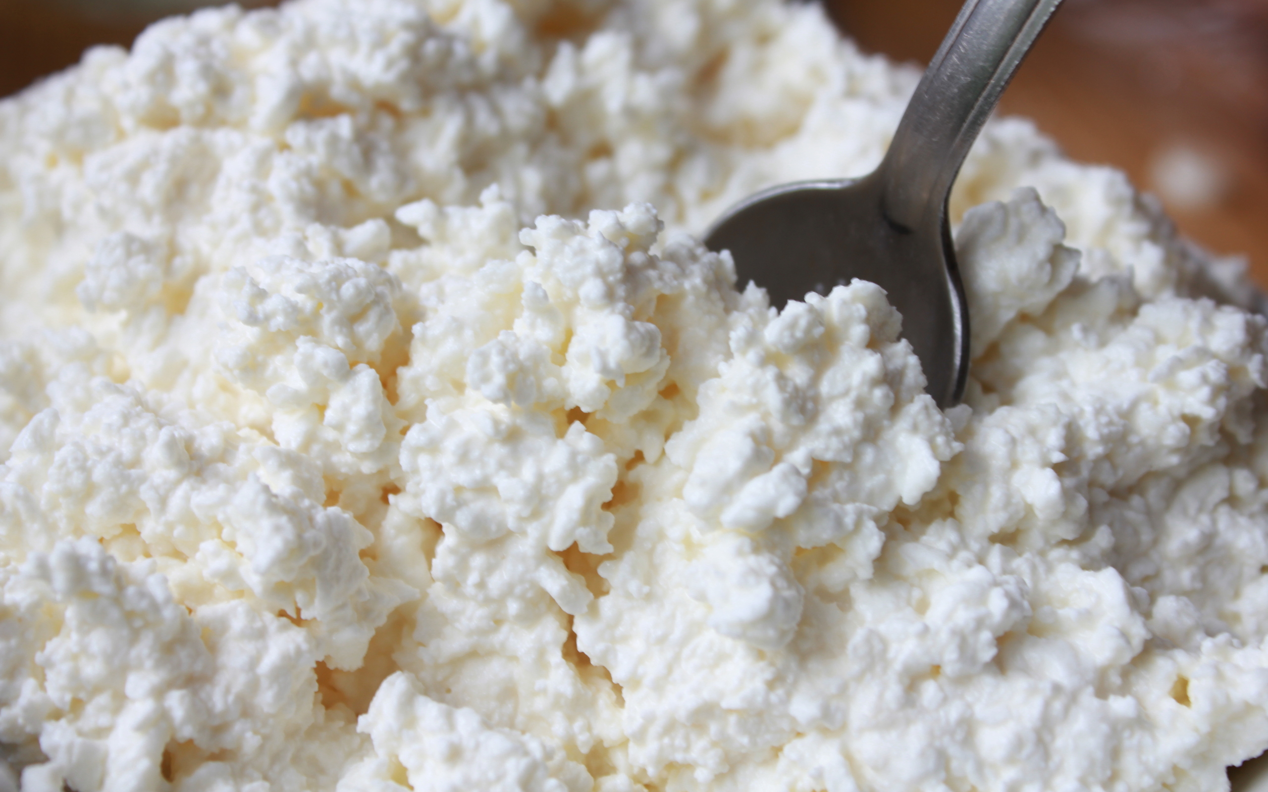Description: A spoon is in a bowl of cottage cheese on a table top with a wooden surface and a wooden table.