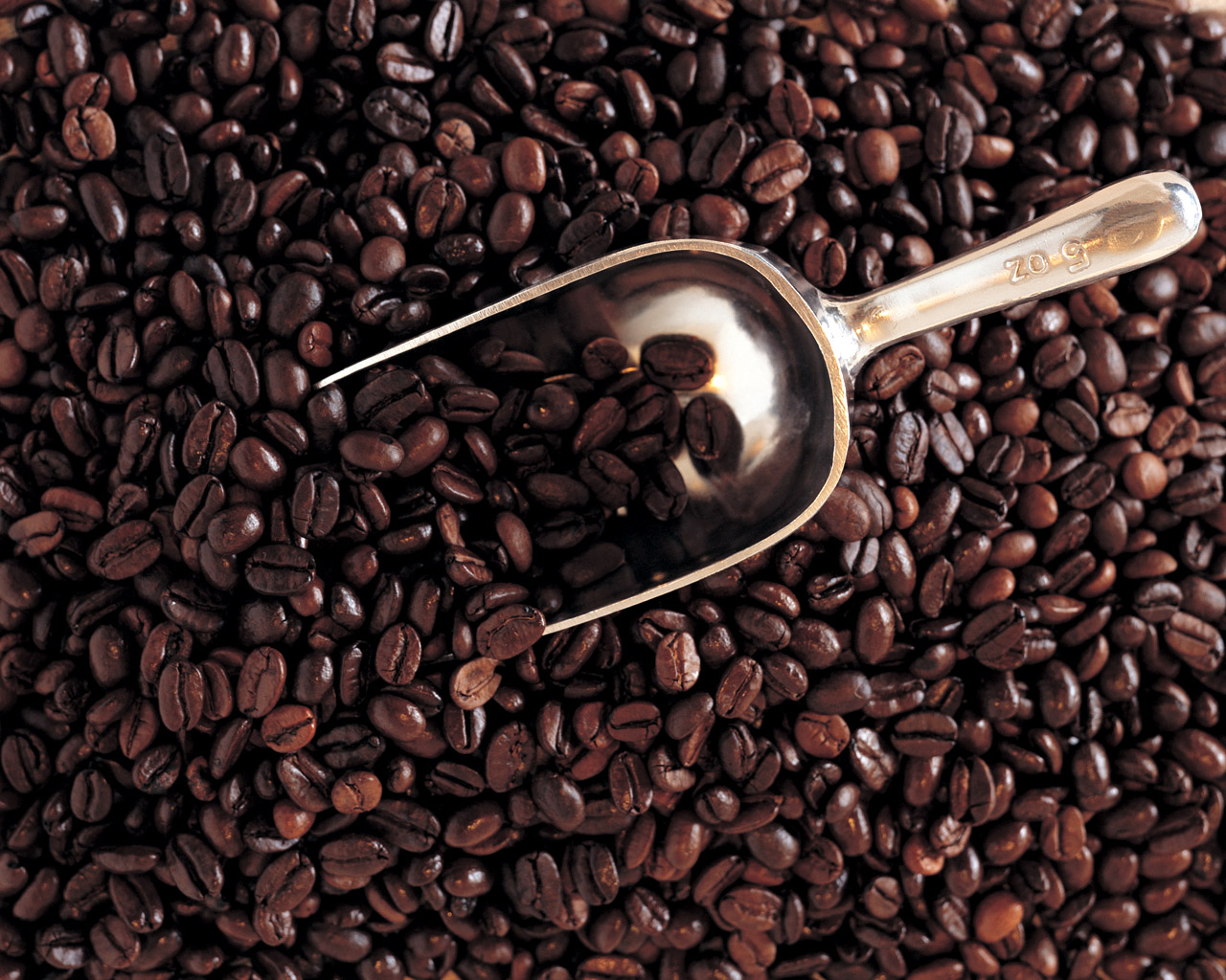 Description: A spoon is sitting on a pile of coffee beans with a spoon in it's middle of the bowl.