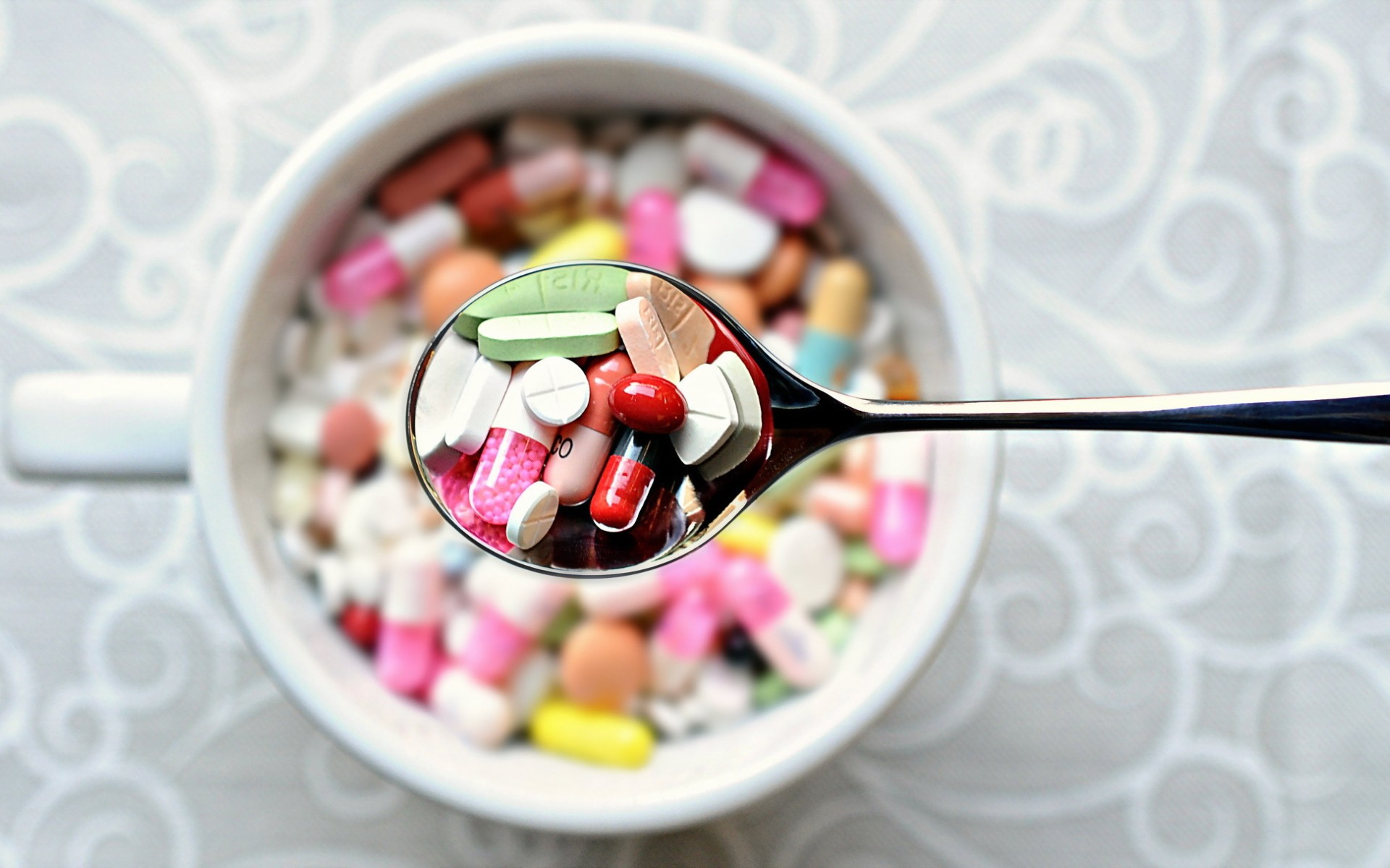 Description: A spoon with a spoon full of pills and pills in it on a tablecloth with a white background.