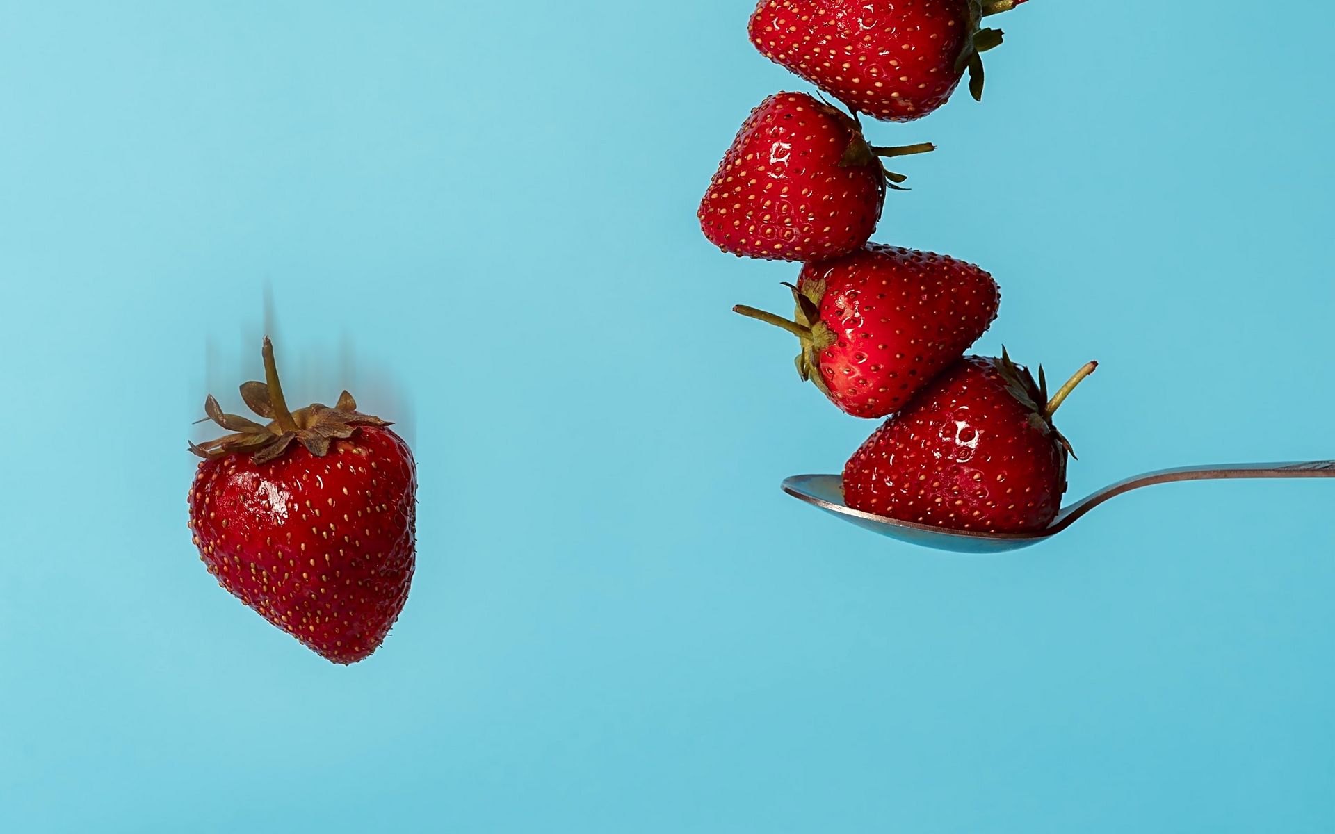 Description: A spoon with five strawberries on it and a blue background with a few strawberries on it.